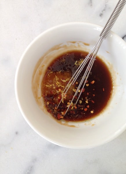 - In a small bowl make the apricot glaze by whisking together the apricot spread, soy sauce, lemon zest, olive oil and red pepper flakes.