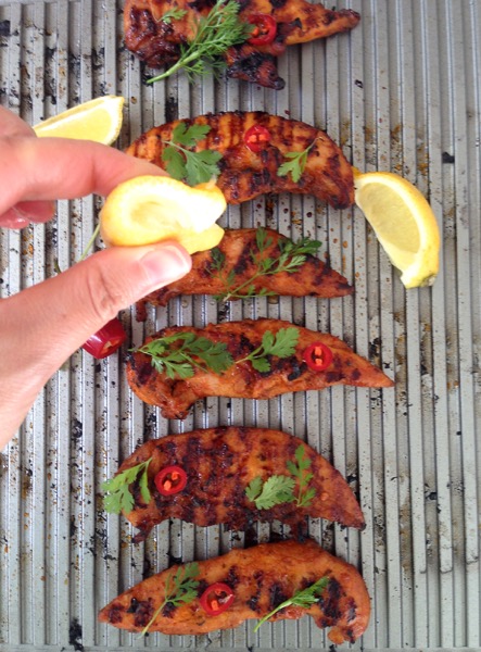 This might be the fastest easiest chicken dinner, finished with just a nice squeeze of fresh lemon, some red chile slices for extra heat and some lively cilantro. I never thought I’d have another piece of non stick cookware in my kitchen, but this one made me a believer, especially after I rinsed it with some gentle soap and soft sponge like it was nothing. Looks brand new after cooking all that sticky chicken on it !