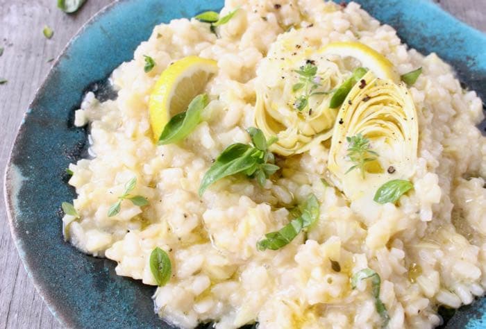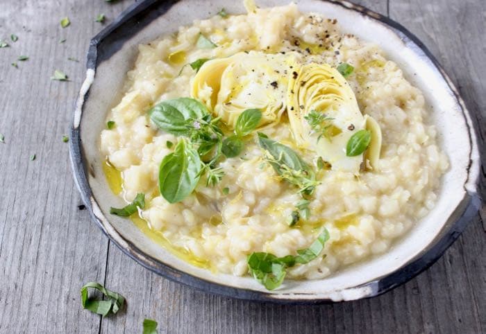 A summery vegetarian side dish: artichoke risotto or Risotto ai Carciofi, with bright notes of zesty lemon, perfumed thyme and basil. Easily adapted to be vegan, can be made with fresh and steamed artichokes or using a canned variety.