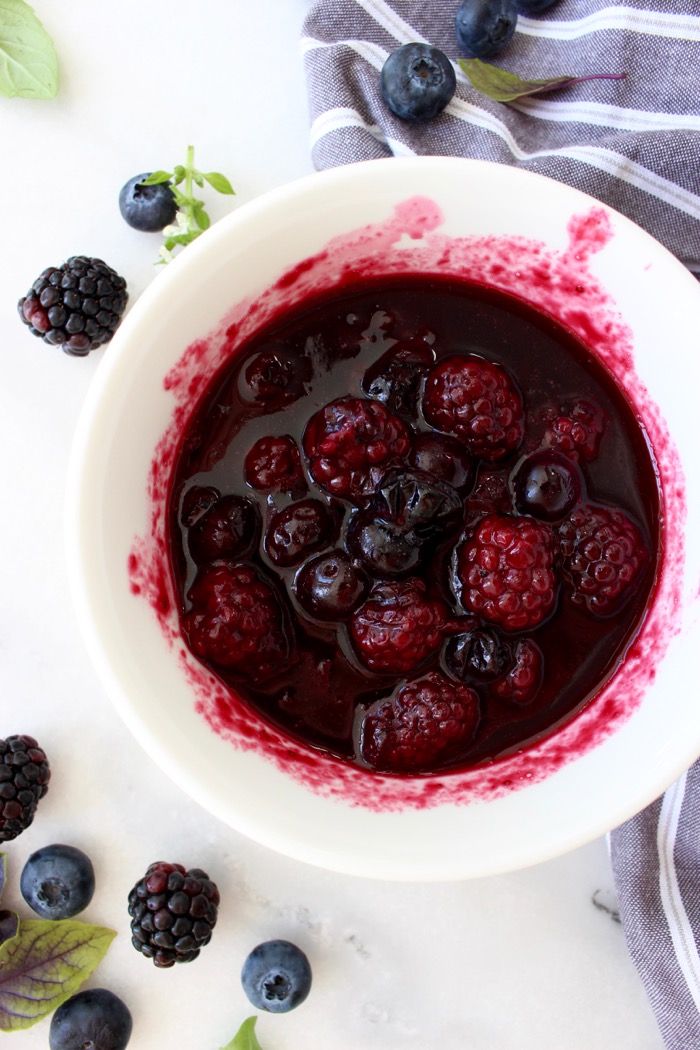 - In a small saucepan add the blackberries and blueberries together with the lemon juice, vanilla extract, honey and 2 tbsp of water. . Bring it to a simmer on low flame, cover with a lid and simmer together for a few minutes until the blueberries have popped. Allow to cool. Once cooled off strain the berry sauce separating the liquid from the solids.
