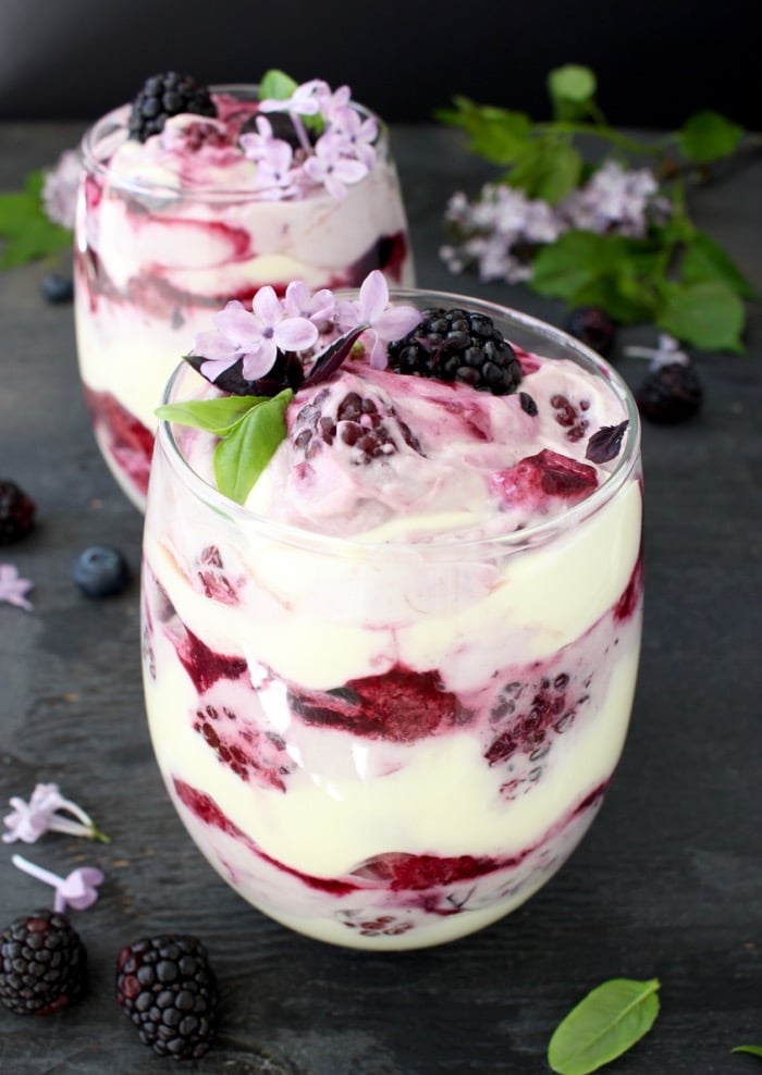 - Serve chilled garnished with some fresh blackberries, fresh basil and a few lilac blossoms if available.