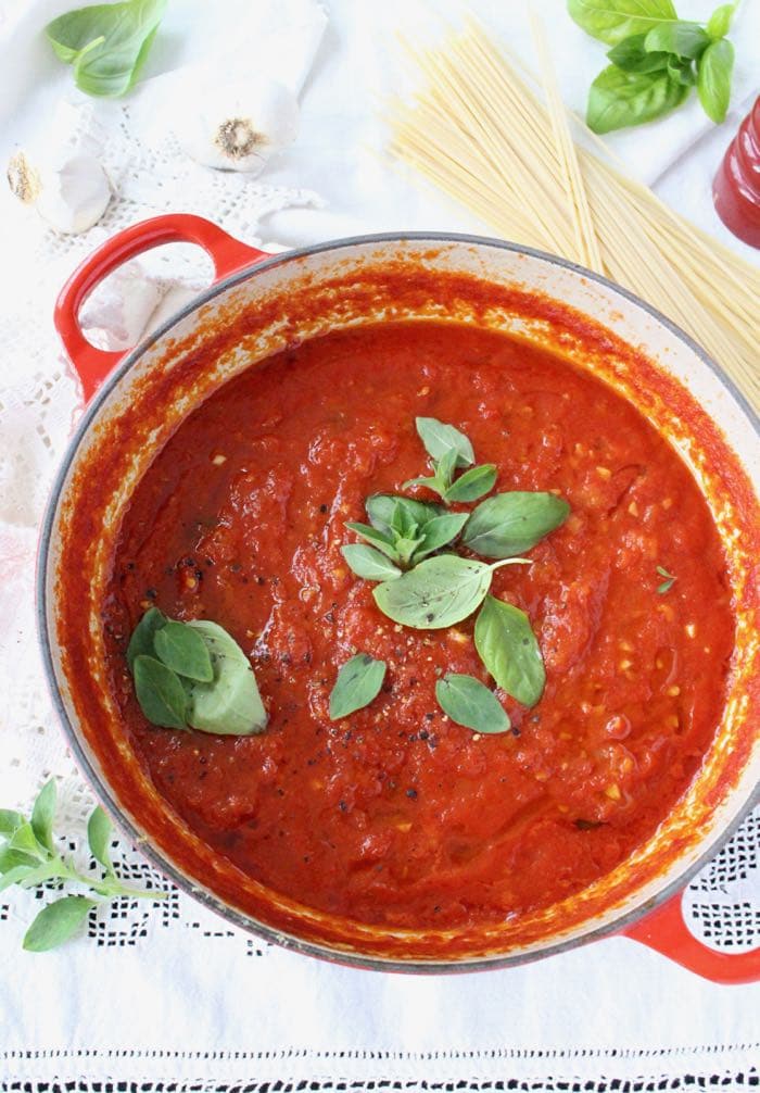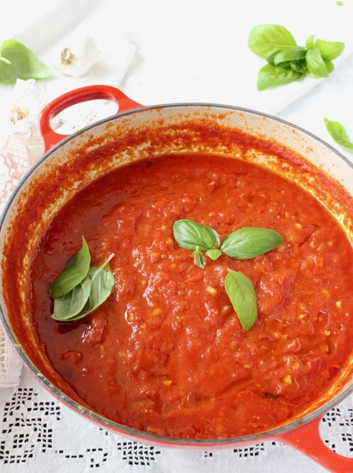 The secret to the classic Italian pomodoro sauce, lies in slowly simmering the tomatoes with onion, basil and garlic until thick and reduced and the natural sugars have concentrated their flavors. So thick you can literally use it as a pizza sauce as I do of course.