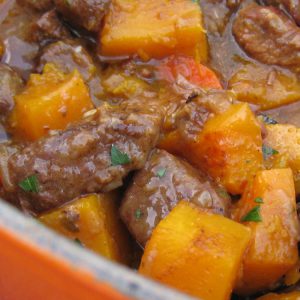- Add the butternut squash and carrots to the pot, give it a good stir, cover tightly with the lid and let cook in the oven for an additional 45 minutes or until the meat and vegetables are tender.