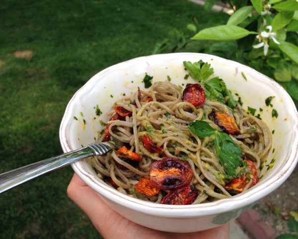Someone once said that the simple things are always the most impressive. Especially when it comes to food in my opinion, and since it is tomato harvest day at the shack I threw a bunch of them under the broiler with some fresh thyme. Perfect little addition to sauces, pasta and risotto even sandwiches but most importantly healthy and delicious. Or do as I do and sprinkle them on top of a bowl of soba noodles coated in Mango Chimichurri Sauce ! Heavenly !