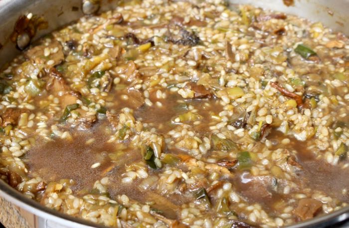 - Add another 1/3 of the mushroom stock to the pot with the rice and stir well. Cover and cook an additional 15 minutes stirring hard way through.