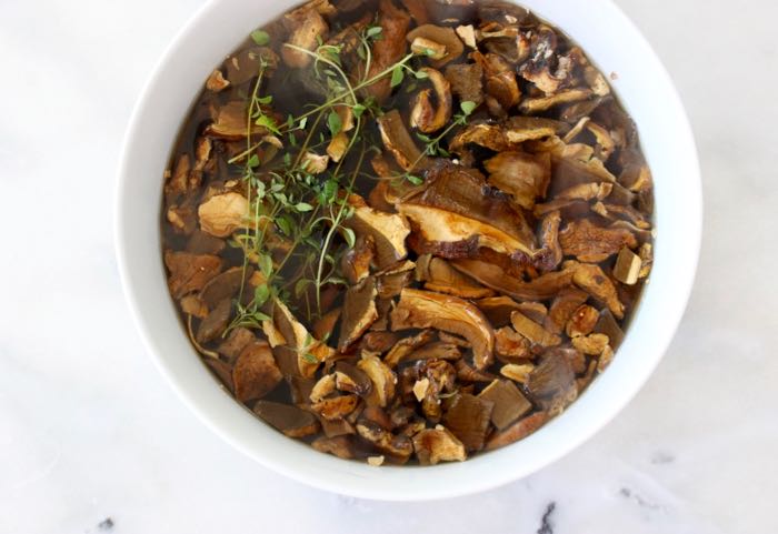 - Add the dried mushrooms together with the thyme to a large bowl and pour the hot water over them. Allow to sit for 25 minutes.