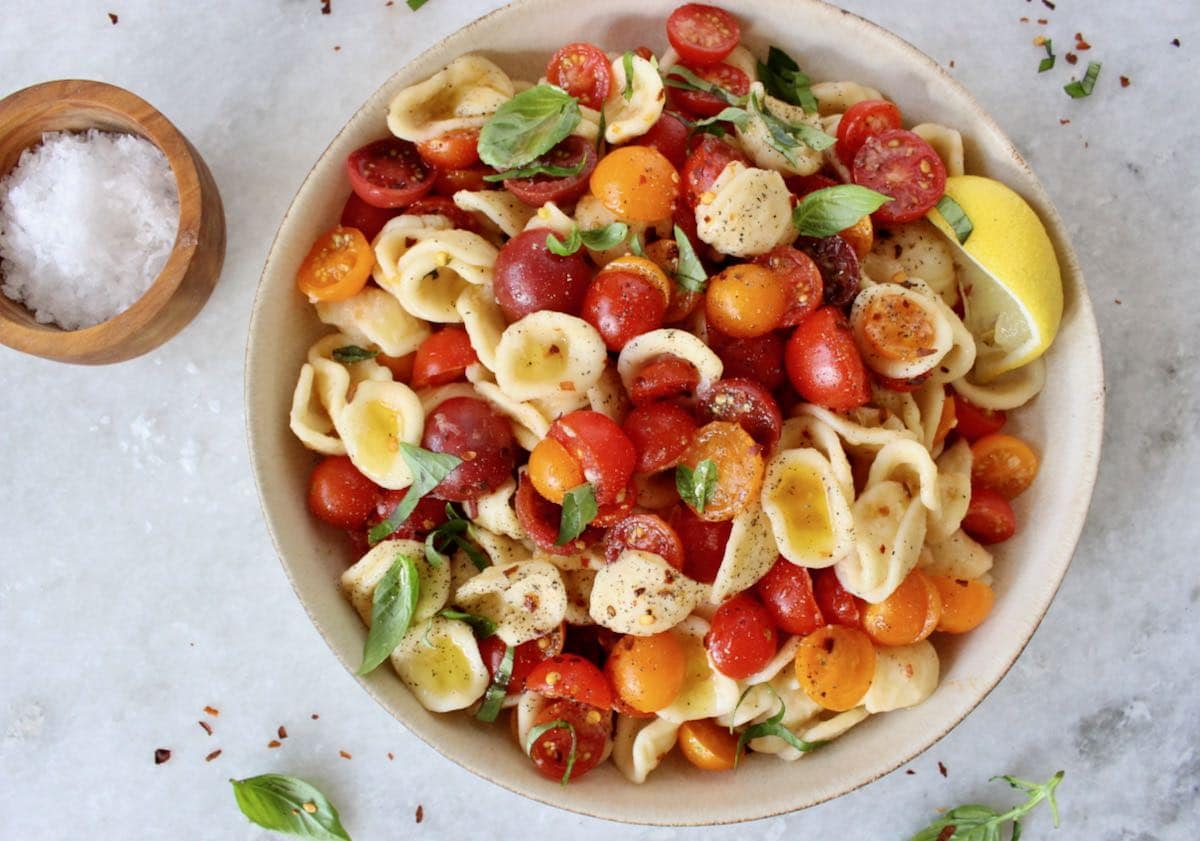 A fresh riff on the classic capellini pomodoro dish featuring all the flavors of an authentic Italian bruschetta bread. The chewy orecchiette pasta here takes the place of the garlic rubbed bread tossed with the zesty and juicy cherry tomato basil mixture.