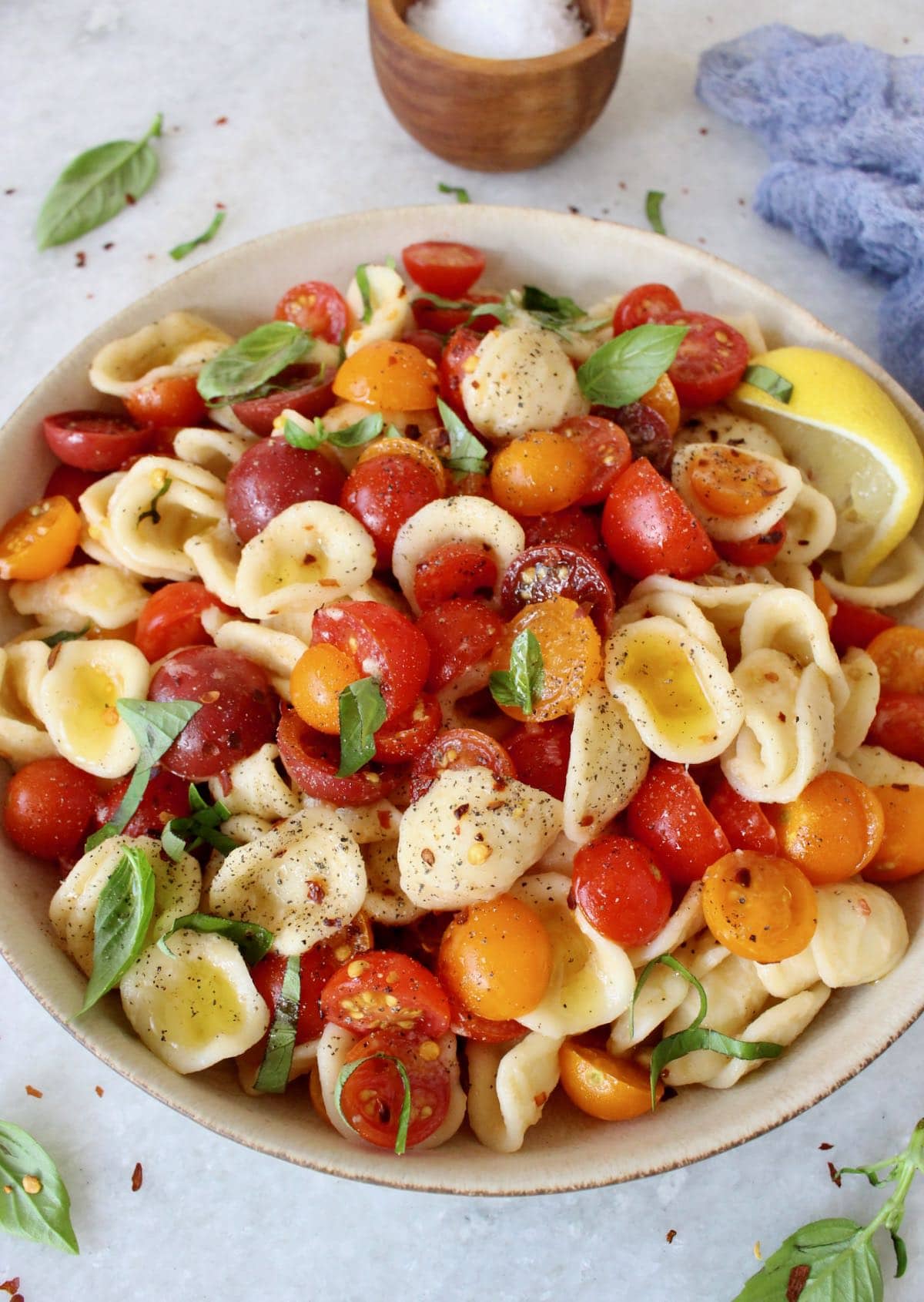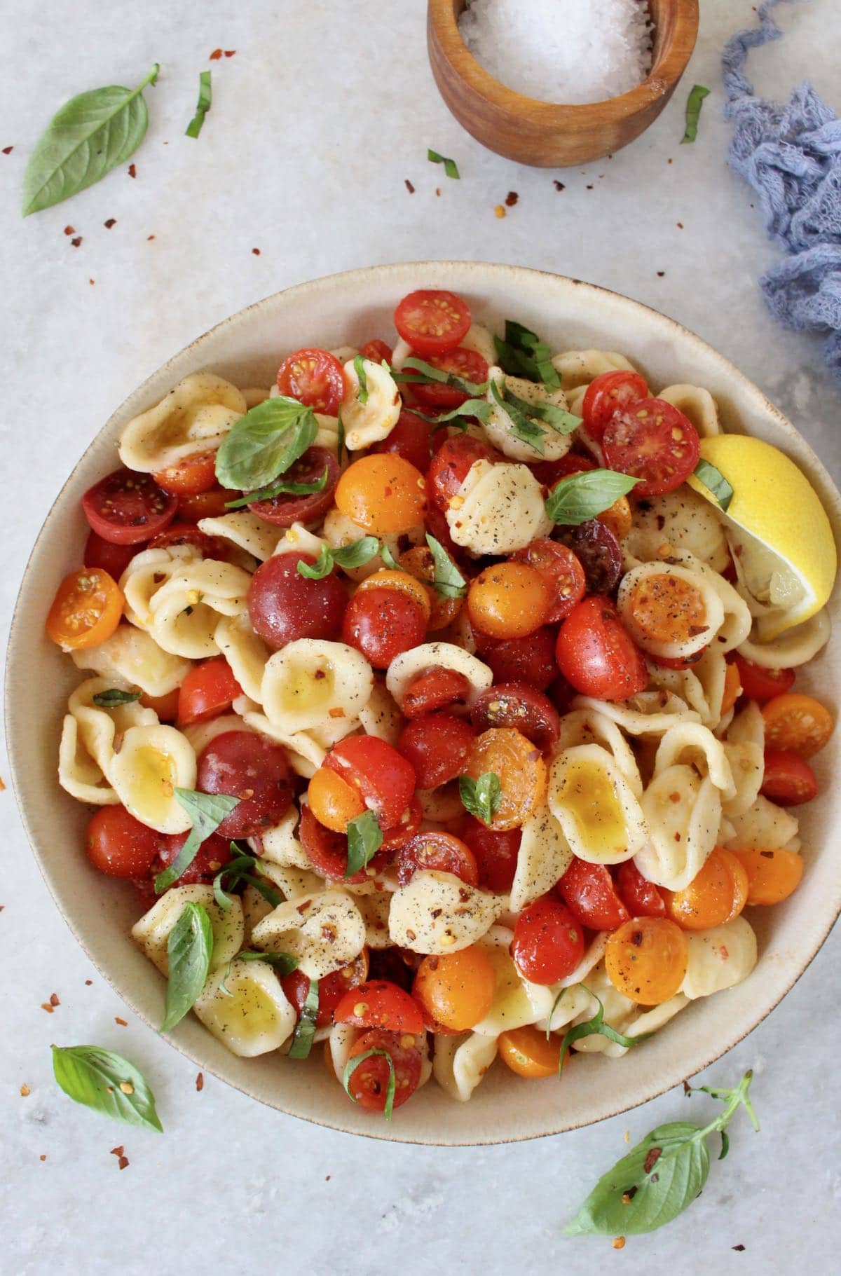 - Add the orecchiette to a large mixing bowl together with the marinated cherry tomatoes and all their juices / marinade. Toss to combine and stir in the basil.1 lb orecchiette pasta, 1/2 cup fresh basil, 2 lemons, 1/4 cup extra virgin olive oil + more as needed, 4-6 cloves garlic