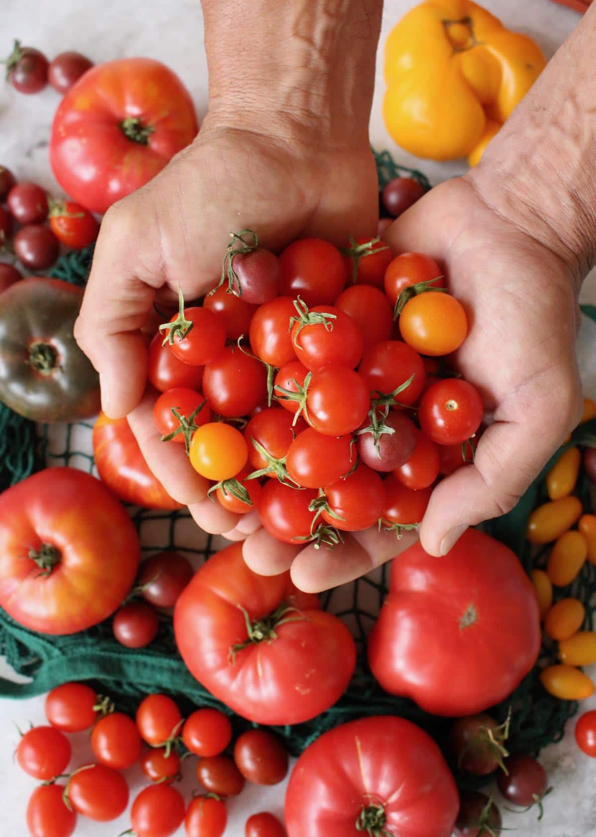 Choose a mixture of sweet and juicy cherry tomatoes, each color tastes a little bit different and brings its own magic to the dish. Any heirloom tomatoes diced up into similar size as the pasta you are using will work great here. It’s important to allow them to sit and macerate in the lemon, garlic and olive oil dressing while the pasta is boiling. This will result in the most delicious fresh sauce while the acid will also tame the pungency of the fresh garlic.