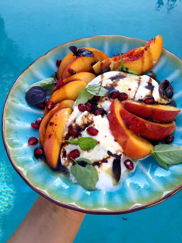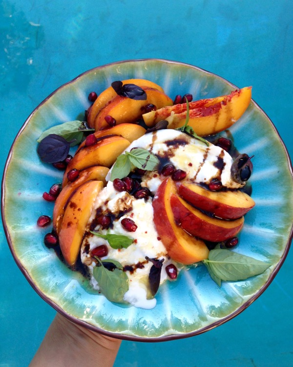 Not like I can take much credit for it, I just threw the stuff together. Again, just perfect nature showing off like forget about it! Basically creamy burrata cheese, perfect yellow peaches, fresh basil from the garden and a handful of pomegranate seeds to balance out the sweetness and creaminess of the dish.