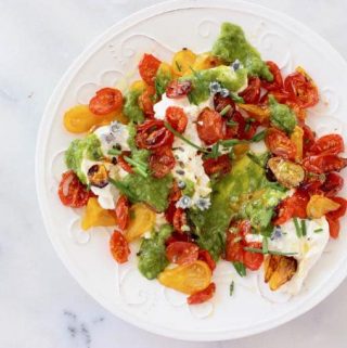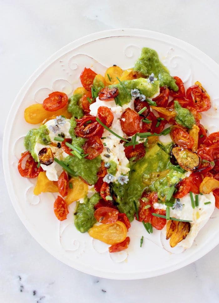 I’ve made so many roasted tomato salads in my life, but this one served over pouches of fresh burrata cheese and drizzled with a zesty scallion dressing takes the cake.