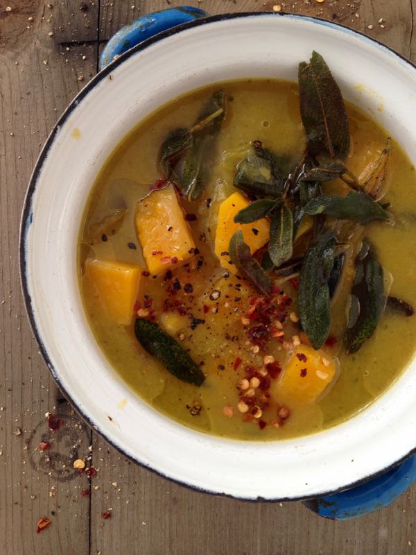 - Laddle the soup into bowls and serve with the crispy sage leaves on top and a good sprinkling of red pepper flakes and freshly cracked black pepper.