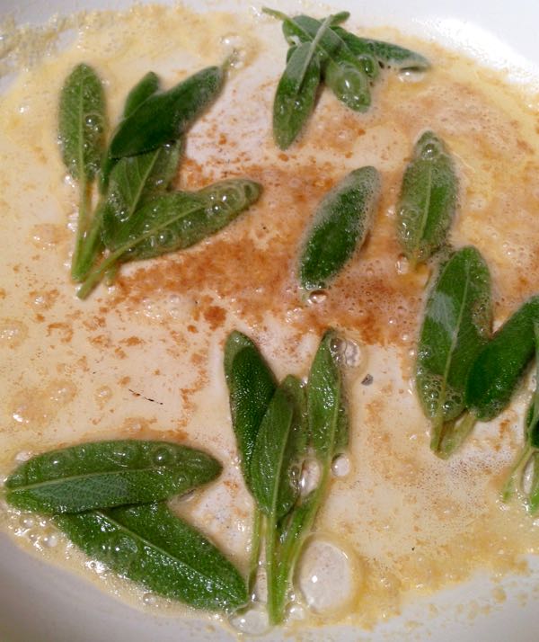 - Meanwhile melt the butter in a large skillet on medium low flame. Add the sage leaves and crisp them up in the butter for about a minute making sure not to burn them