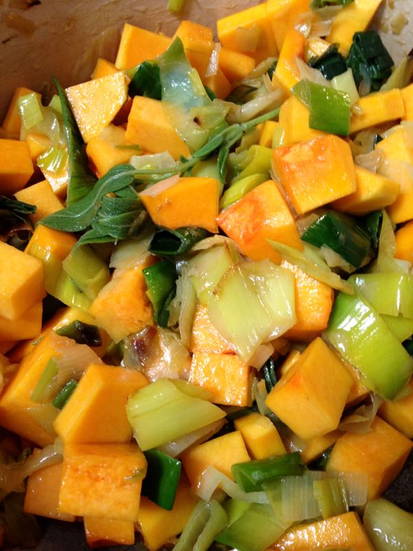 - Add 2 sage sprigs and the butternut squash cubes to the leeks and cover with the water. Bring to a simmer, add the sea salt and cover with a lid. Cook for about 30 minutes until the butternut squash is cooked through but still al dente not mushy.