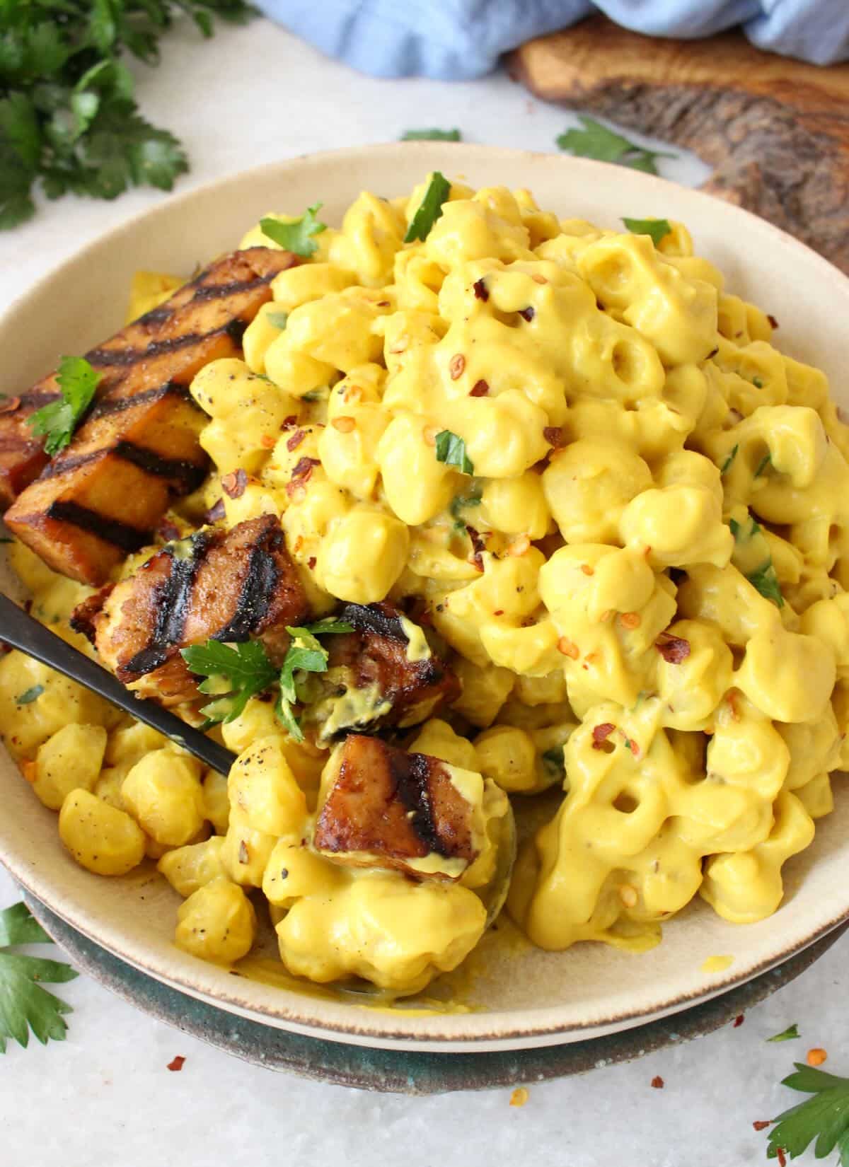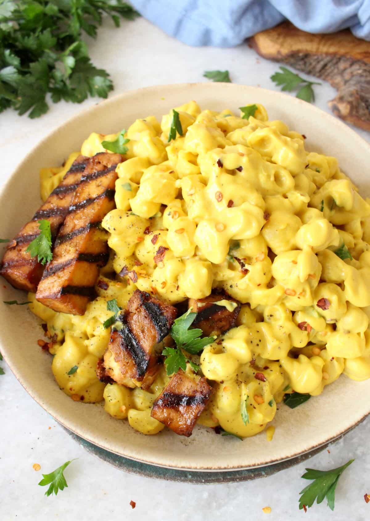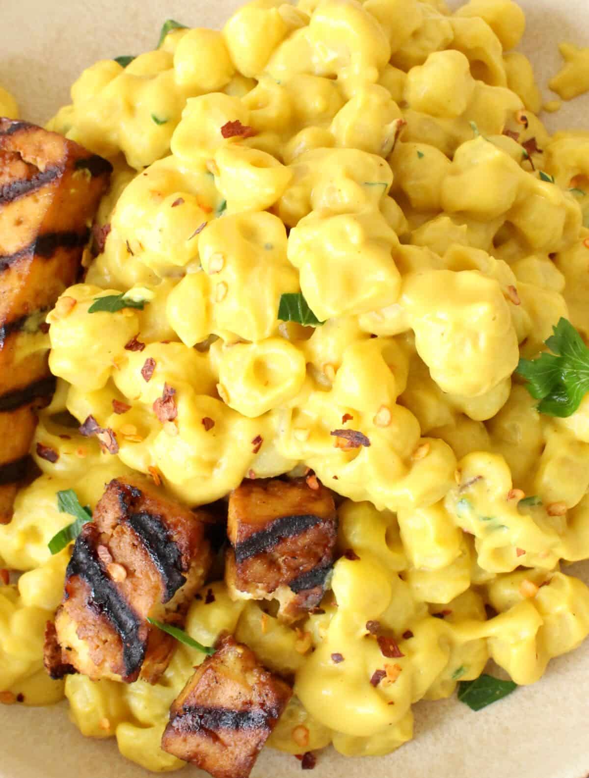 - Grilled Tofu - To prepare the grilled tofu in the photo start with a pack of firm or extra firm tofu (drained + pressed of excess of water + sliced into sticks). Marinade: 1/4 cup Tamari + 1 Tbsp maple syrup + 2 tsp liquid smoke. Combine and coat all over and allow to sit for 20 minutes. Preheat a cast iron grilled over medium high heat and lightly brush with oil to prevent sticking. Grill the tofu for a couple of minutes on all sides until nice grill marks form. Serve with the butternut mac.
