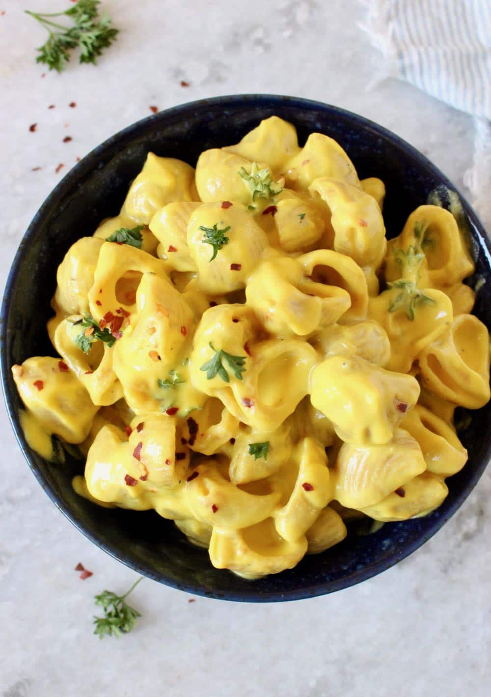 If you are looking to make a festive, super delicious mac without lactose, milk or processed cheese, this out of this world butternut squash mac and cheese recipe is for you. A veggie packed silky cheesy sauce featuring deliciously golden butternut squash, nutritional yeast, cashews and aromatics. It all comes together in the blender and ready to coat your favorite pasta in no time.