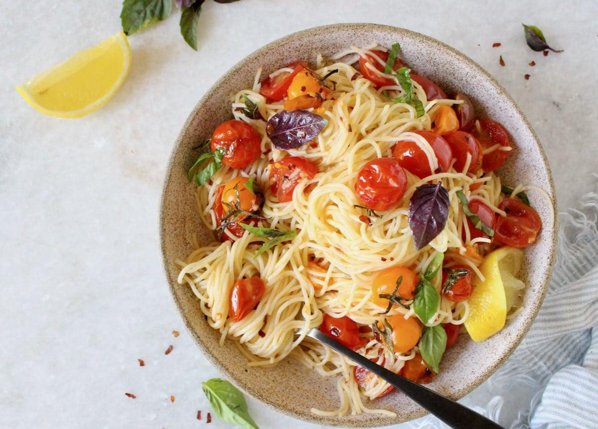 The best Capellini Pomodoro pasta bowl of all times. An easy, light and zesty sauce made with fresh tomatoes and basil. This simple, meatless, dairy free recipe is the absolute perfect weeknight dinner.