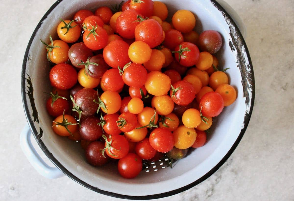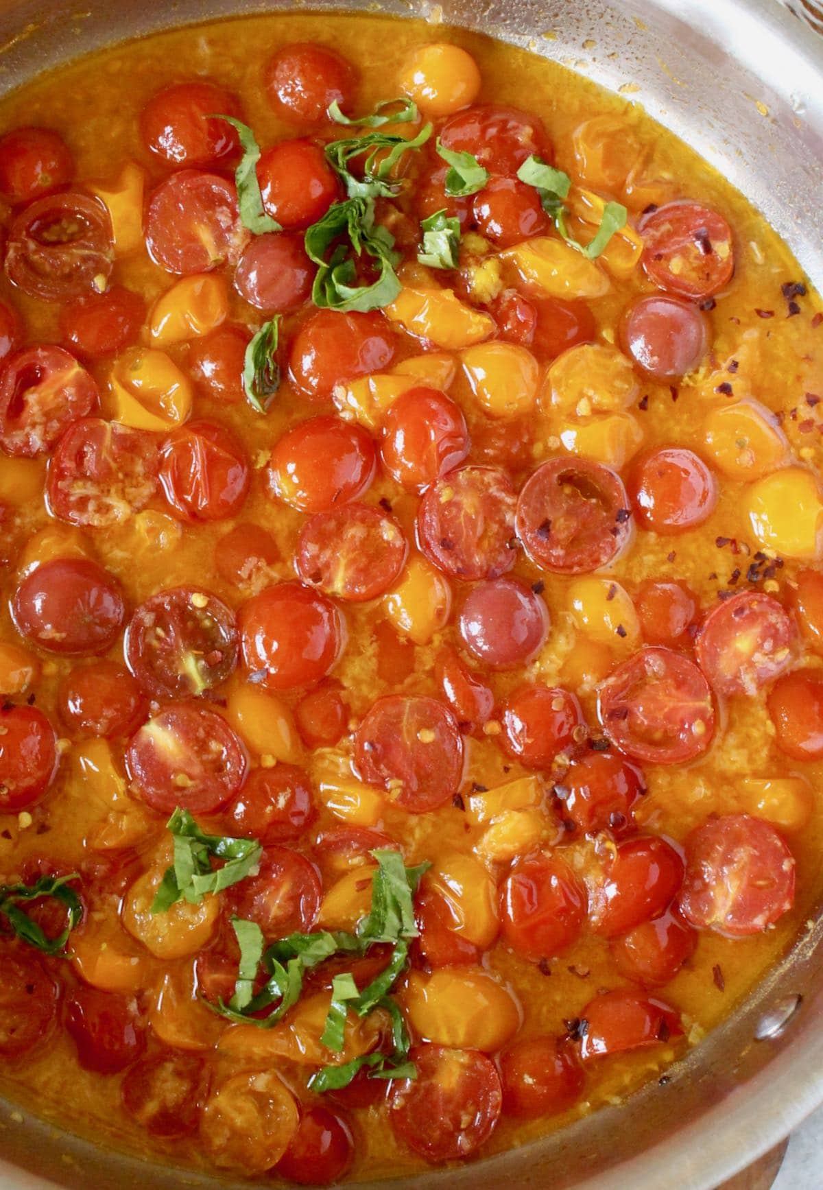 - The Tomatoes -I love using a mix of sungold and red cherry varieties for their sweet flavor and thin skins. Stay away from grape tomatoes which are on the dryer side with tough skins and not suitable in this recipe. Using canned tomatoes would be a total disappointment, save those for slow simmered sauces like marinara, arrabiata or puttanesca.