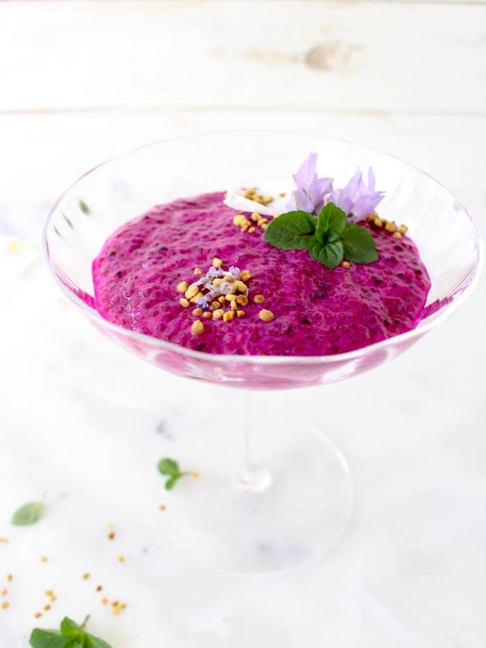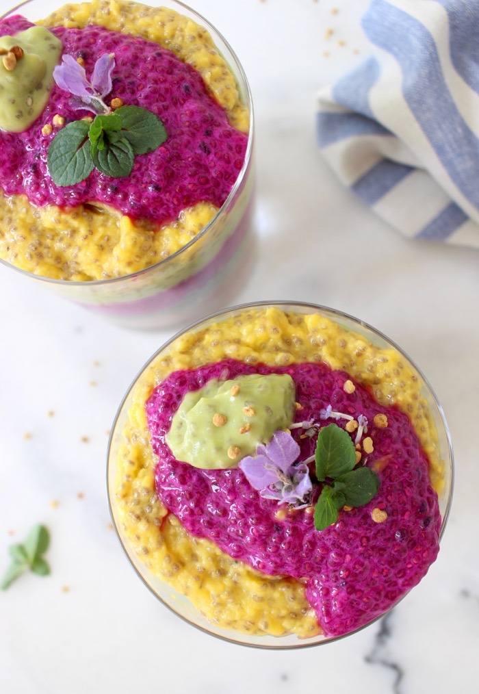 - Spoon a layer of each flavor of the chia seed breakfast pudding divided between 4 glasses. You can arrange the layers in your favorite order, garnishing with edible flowers and a sprinkle of bee pollen.