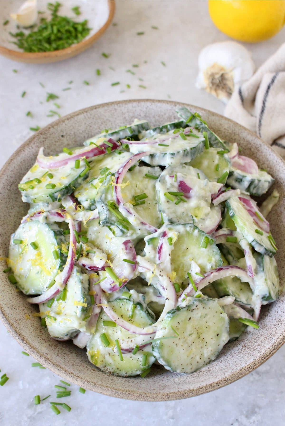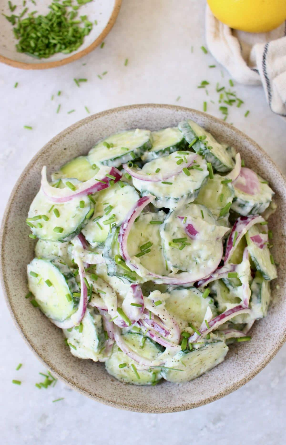 Creamy Cucumber Yogurt Salad recipe with crisp red onion dressed in a dairy-free Greek yogurt lemon dressing with a classic kiss of fresh dill. A quick and easy refreshing summer salad best served right away alongside new potatoes or stuffed inside some gyros pockets.