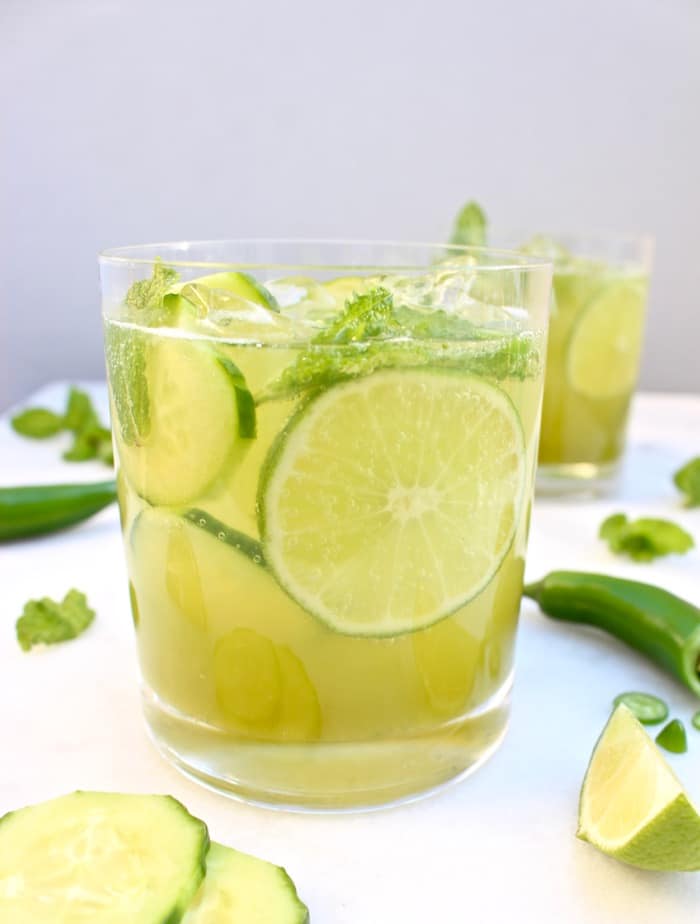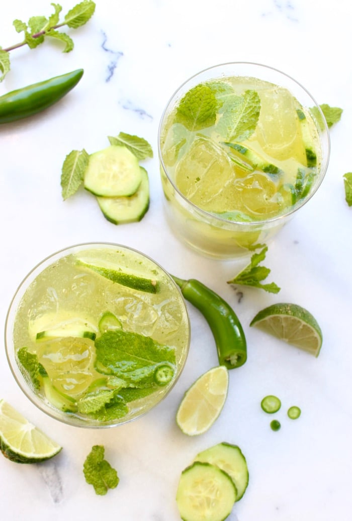 - Stir in the rum, vodka or tequila and poor the Mojitos over ice. Garnish with the reserved cucumber slices, like slices, mint and green chile slices.