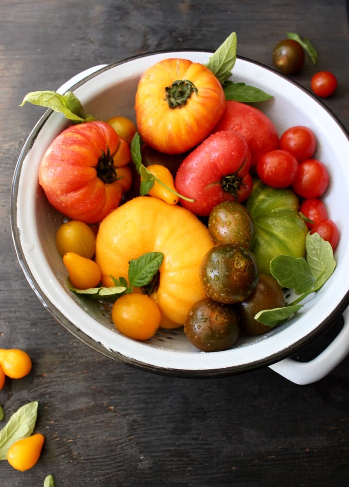 - Heirloom Tomatoes – the royalty of tomatoes, sweet, juicy, aromatic, gorgeous. Use a mix of different colors and shapes for the ultimate flavor profile and visual effect.