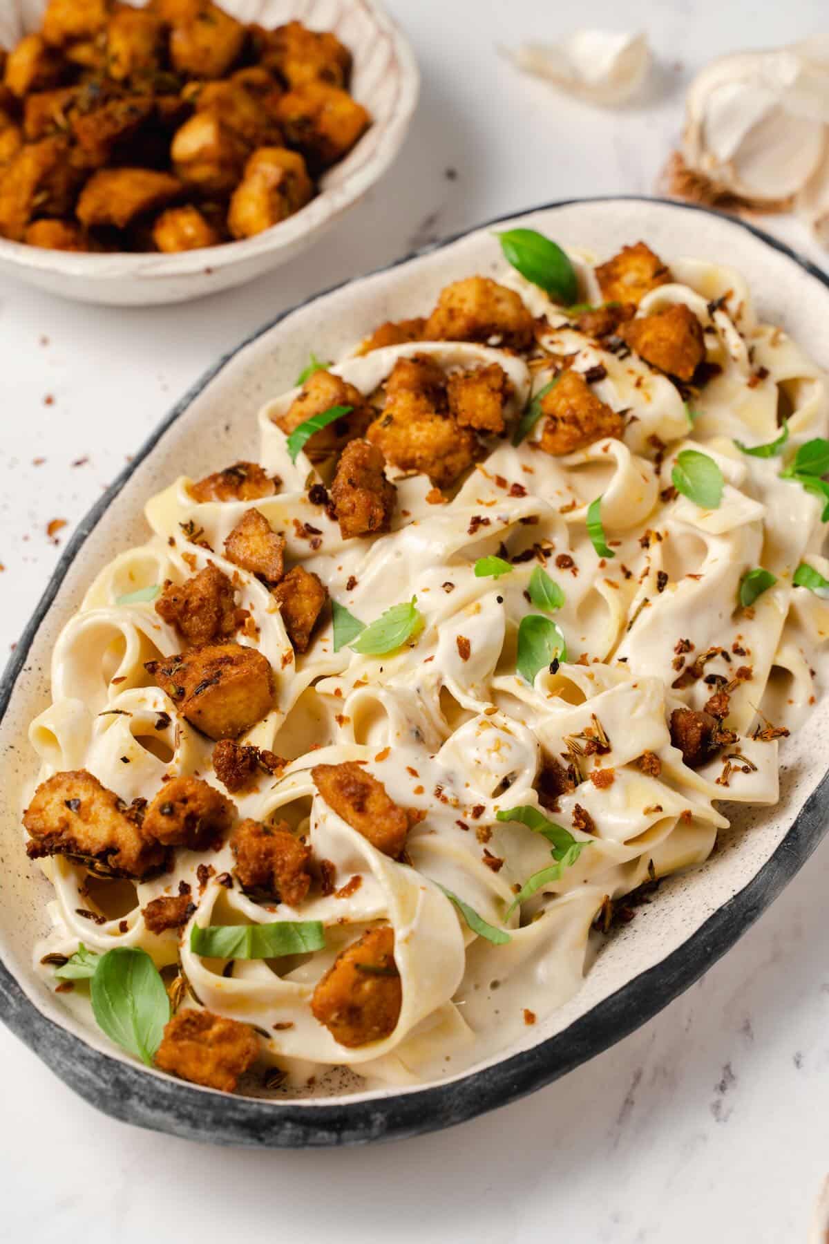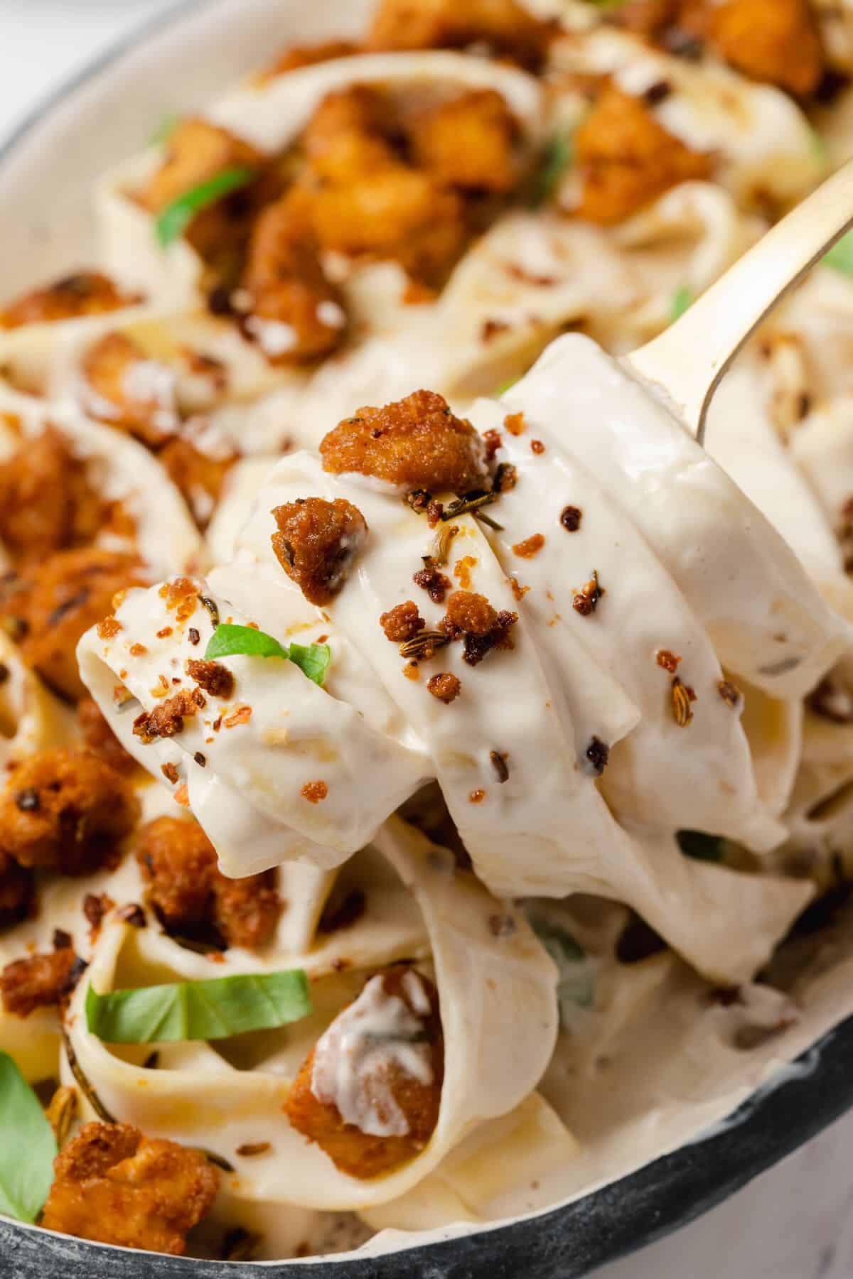 - Noodles – Traditionally Alfredo sauce is served with flat and narrow fettuccine noodles and finished with a pinch of freshly grated nutmeg. Pappardelle and tagliatelle which are both flat but wider make great substitutes if need be. Only coat as many noodles in the sauce as you plan to eat at once. I love to top it with crispy roasted Italian sausage tofu crumbles or a sprinkling of homemade Italian breadcrumbs for crunch.