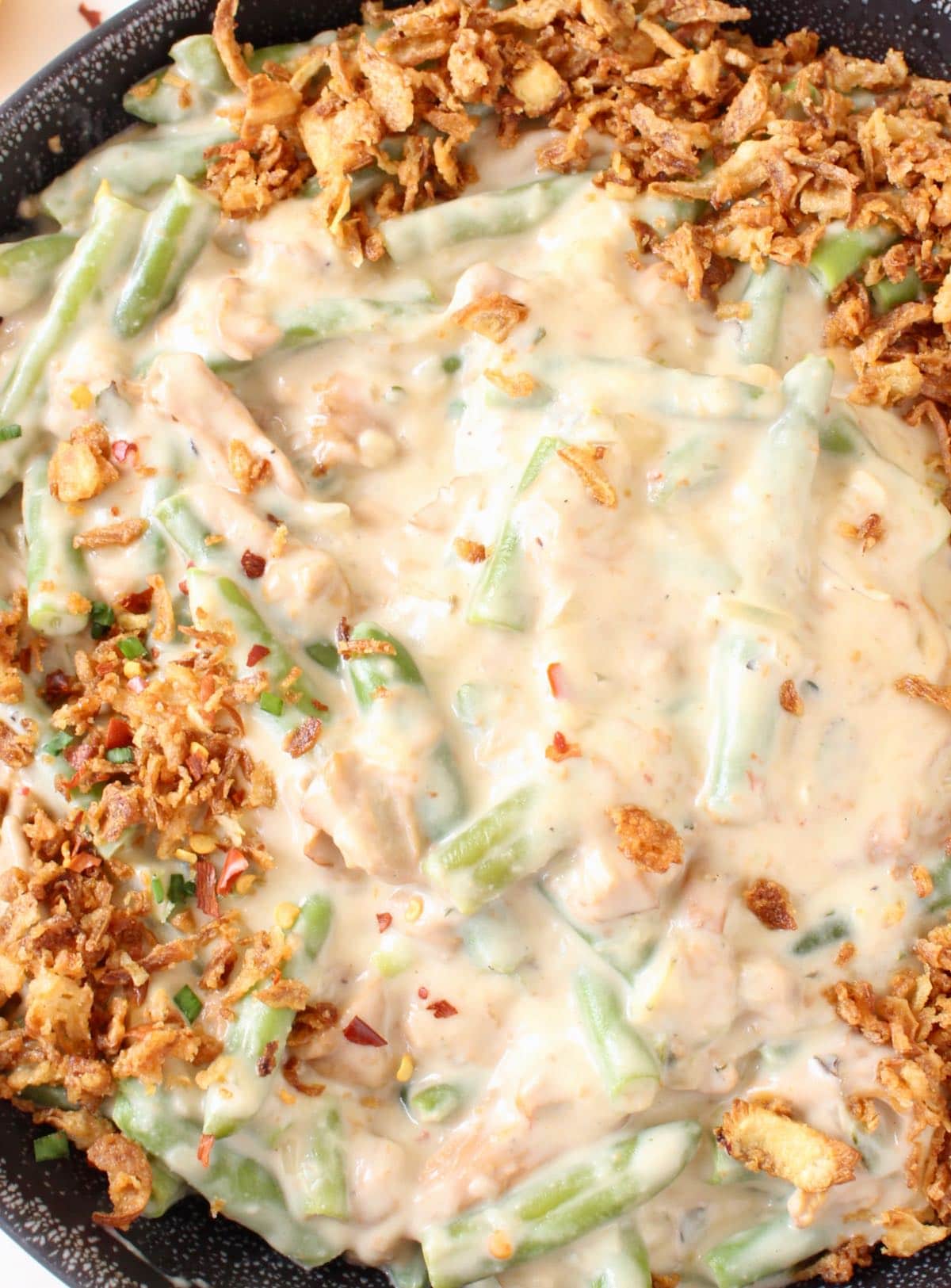 - Crispy Onions - The store bought version is simply perfect! I don't even know anyone who insists on making their own especially during Thanksgiving. Alternatively you could sprinkle your casserole with panko breadcrumb and broil until golden brown, or fry them in some olive oil together with some fennel seeds until crispy golden and sprinkle on top of the casserole before serving. Can't go wrong with either!