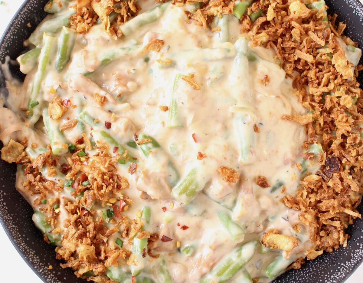 - Preheat your oven to 400 “F. Top the green bean casserole with the panko or the onions and bake for 15 minutes until bubbly and golden brown on top to your liking.