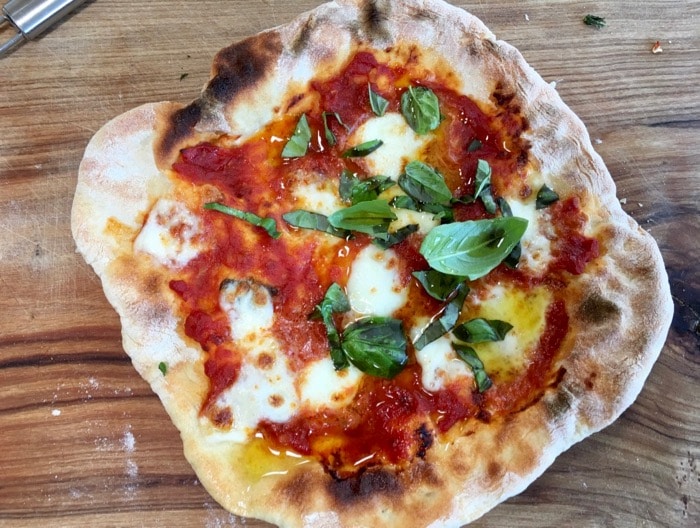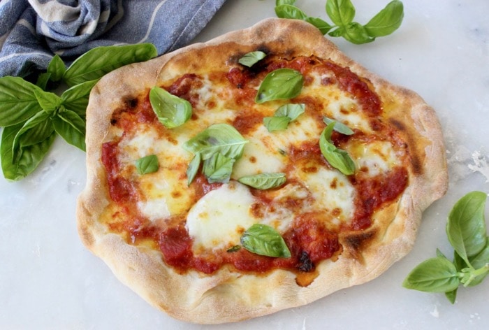 I came upon your website while searching online for a recipe similar to a plate of gnocchi with pistachio sauce that was the BEST that I had ever had in my entire life! It was some time back in a restaurant among a maze of restaurants, steps down from the Teatro Antico di Taormina after enjoying an opera. Try as as might, I have not been able to replicate that glorious, light as air dish. Why didn’t I take that restaurant’s card?! Anyway, I’ve given up trying, but was so happy to find your recipe for Pizza Margherita! I was born & raised in NY and lived in Paris for some years (both places have great pizza!) and traveled often to Italy. Now I live in the Bay area of CA, south of San Francisco and only have awful chain pizzerias nearby! I have to drive for 45 minutes to an hour to find really good pizza. I miss it so much so it’s about time I tried my hand at making my own. Being a “newbie” at this, I have some questions that I hope you’ll have the patience to answer. I’ve read that you use an Emile Henry pizza stone, but I see 2 different kinds for sale: one has ridges and one is smooth. Which one do you recommend? The EH website says to preheat the stone for 10 minutes at 475 F but you say to preheat the stone for much longer and at as high a temperature as your oven will go. My electric convection wall oven reaches 550 F Can this higher temperature possibly break the stone? Also, I don’t have a stand mixer so will be making the dough by hand. How long should I knead it? 20 minutes? Longer? Should I bake the pizza on the lowest shelf, then switch to broil and move it to the top shelf? Will the electric broiler brown as well as a flame? Lastly, if I make the pizza ahead, what is the best way to reheat it? Thank you so much for your answers and any advice you can give. Wish me luck!