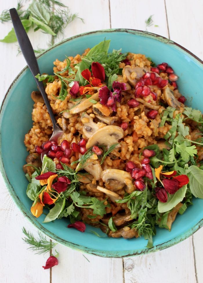 19. Vegan Mushroom Brow Rice: hearty and filling sprinkled with pomegranate seeds, this dish is definitely worth being a centerpiece.