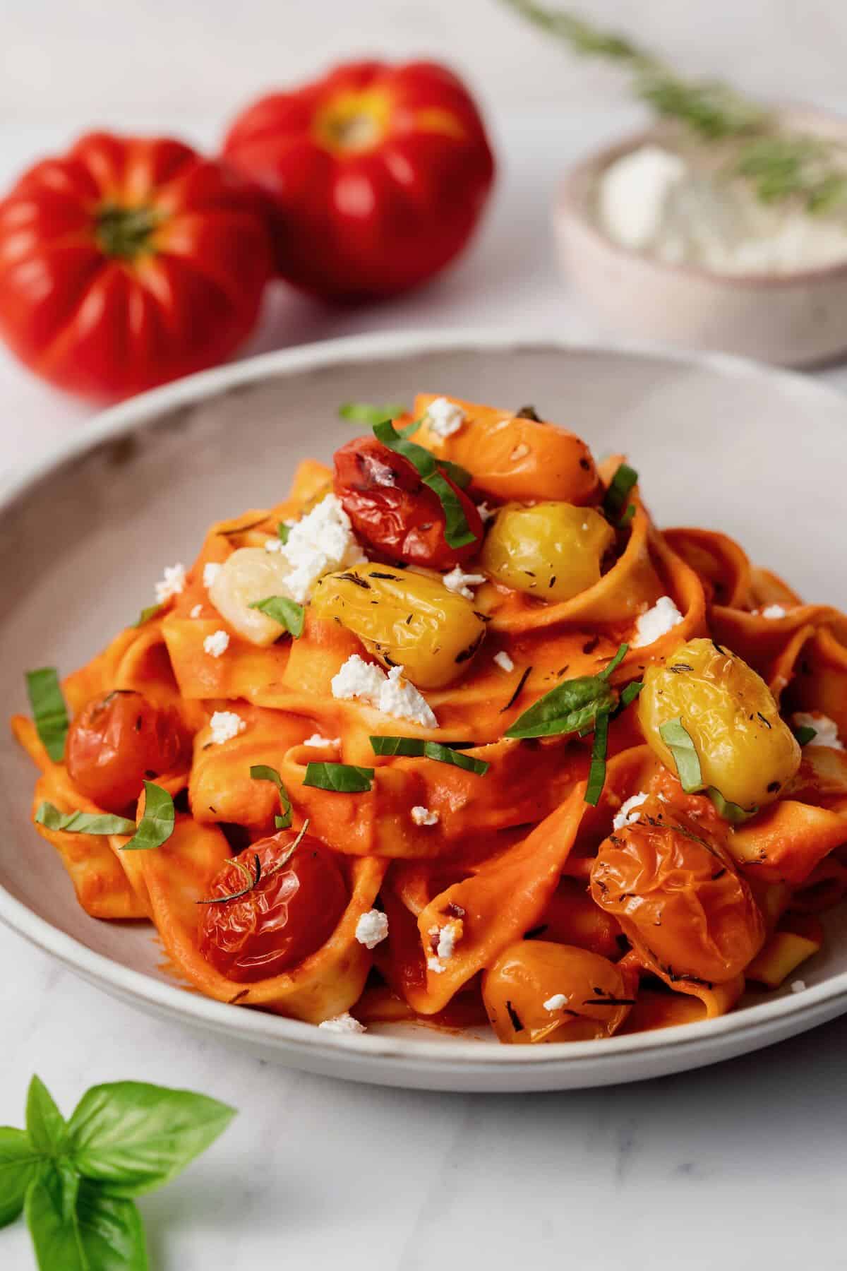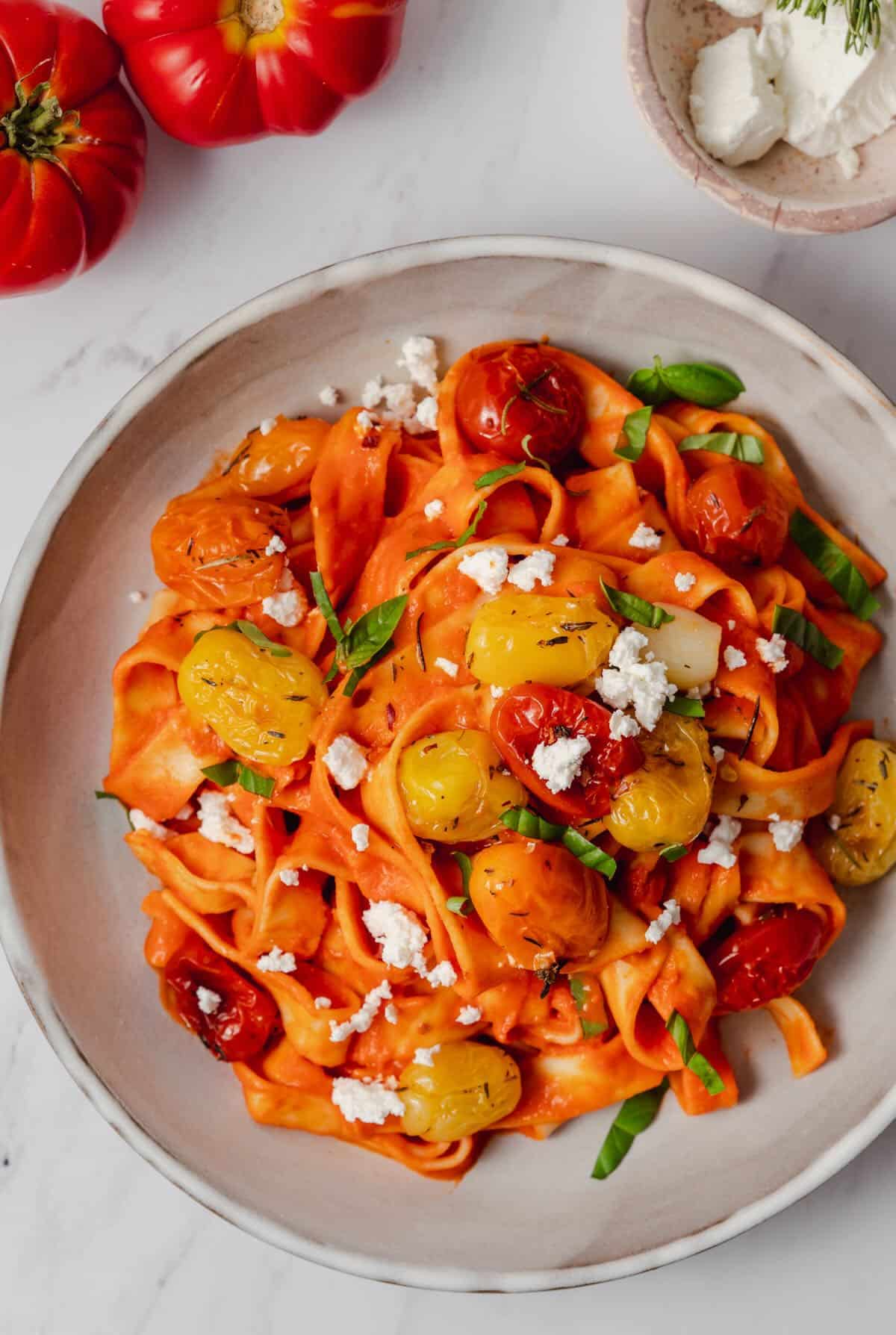 - Divide the pasta between 4 bowls and serve with a spoonful of the roasted tomatoes on top. Sprinkle with red chili flakes, with the basil and some vegan feta crumbles on top.1/3 cup basil for garnish, Vegan feta crumbles for serving