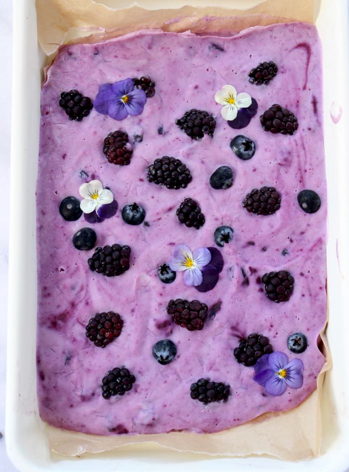 - Sprinkle with the blackberries and some fresh blueberries. Garnish with a few violas id available.