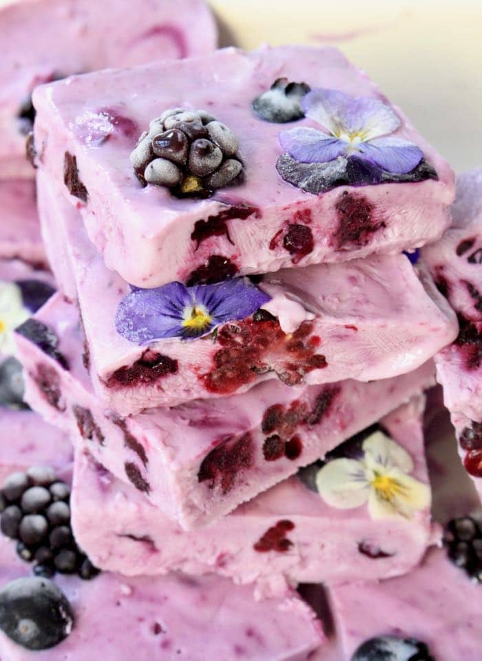 Healthy frozen yogurt bars made with sugar free, non fat creamy Greek yogurt, wild honey, fresh fruit a fruity blueberry purée.