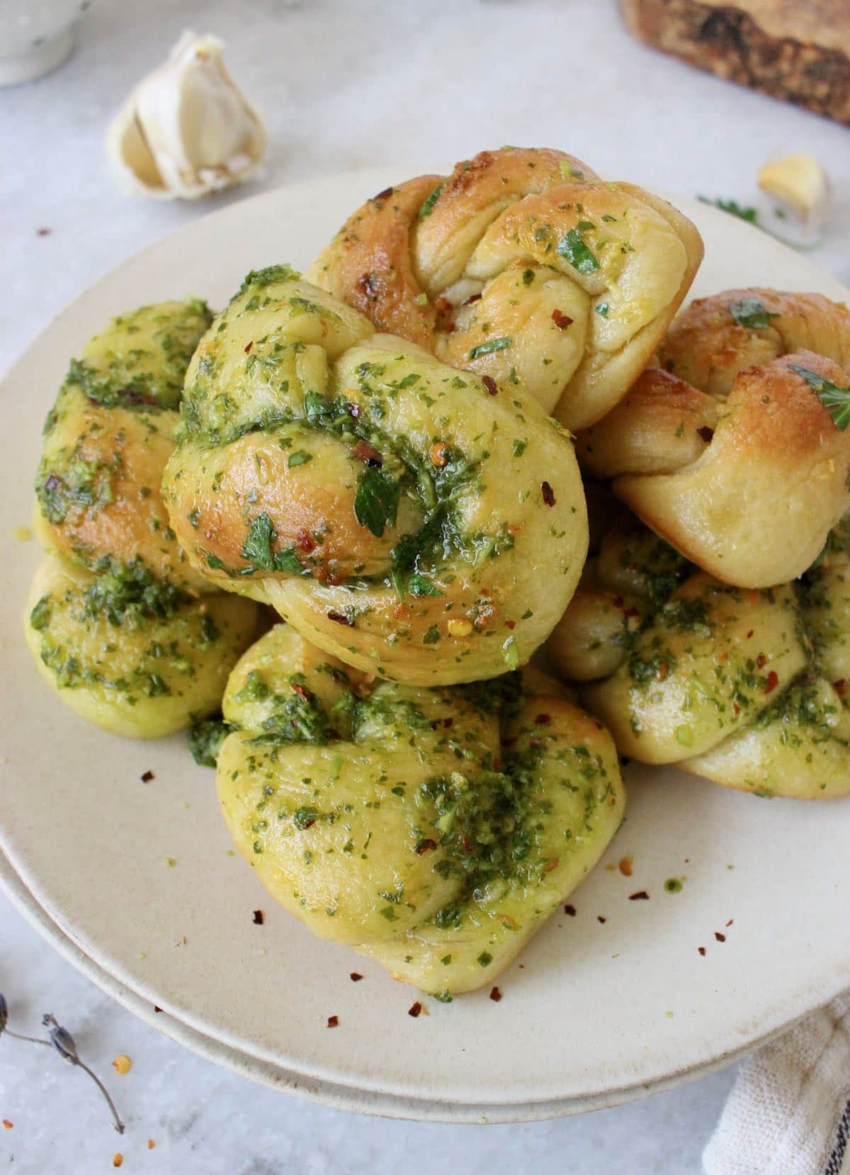- Parsley garlic oil - there's a simple garlic infused oil to brush the knots with before baking, and then a fresher parsley chimichurri style version to brush over the knots after baking, while still hot out of the oven. I love using both but you could just make one and use it for everything.