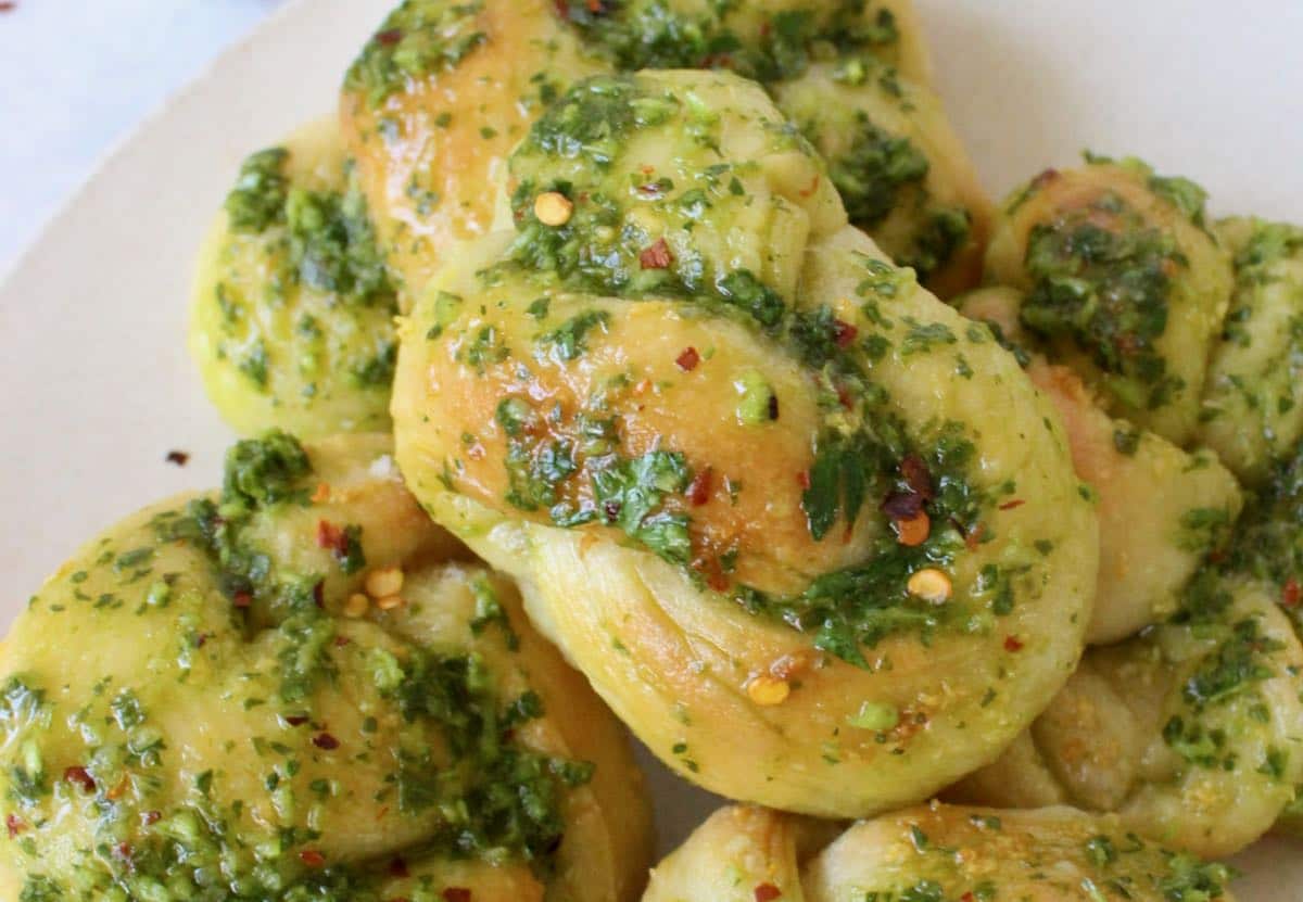 I knew these garlic knots were going to turn out amazing as soon as I saw the recipe called for your Italian pizza dough. Better than any pizzeria I can remember + brushing them with pesto is genius. Most definitely recommend