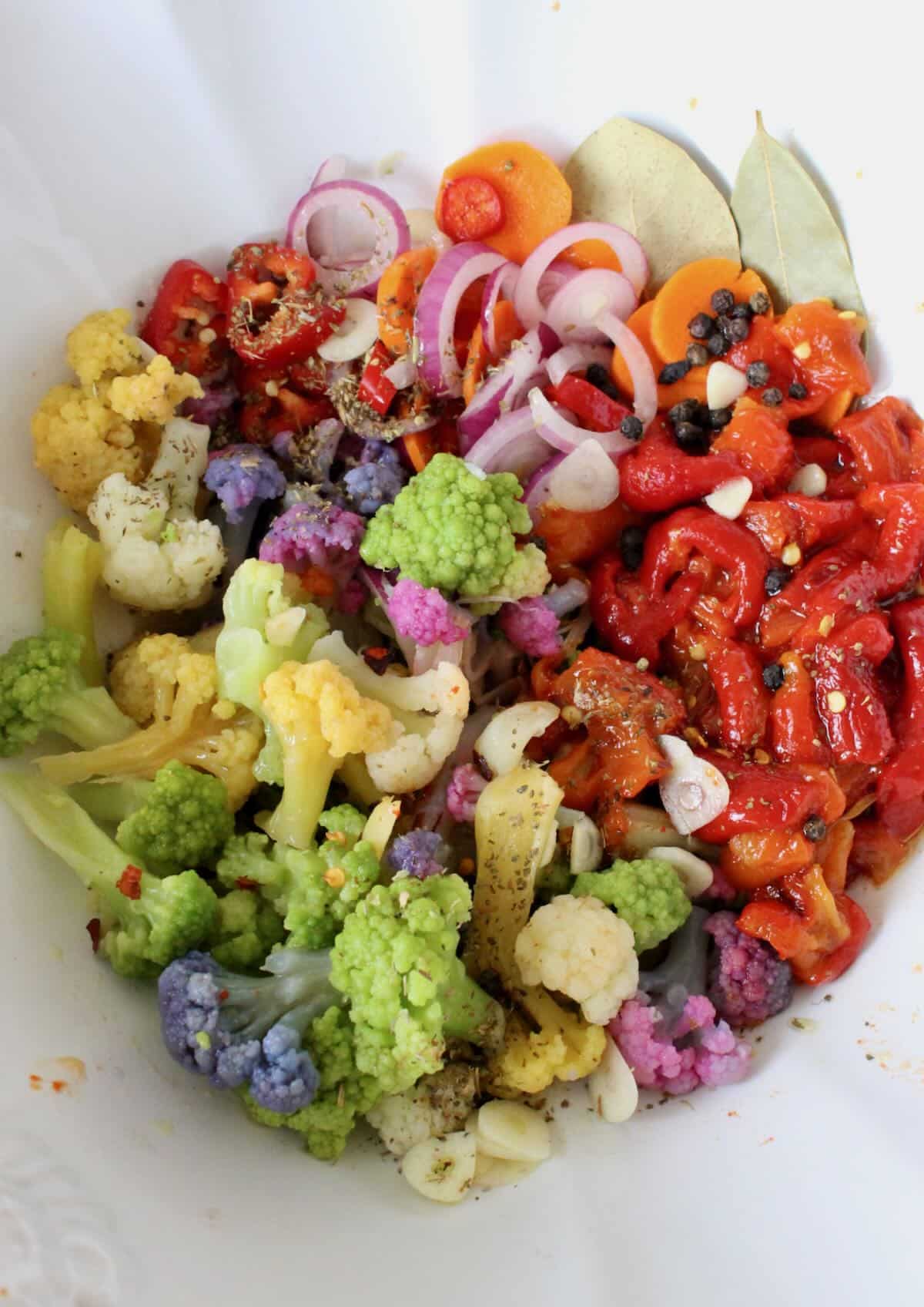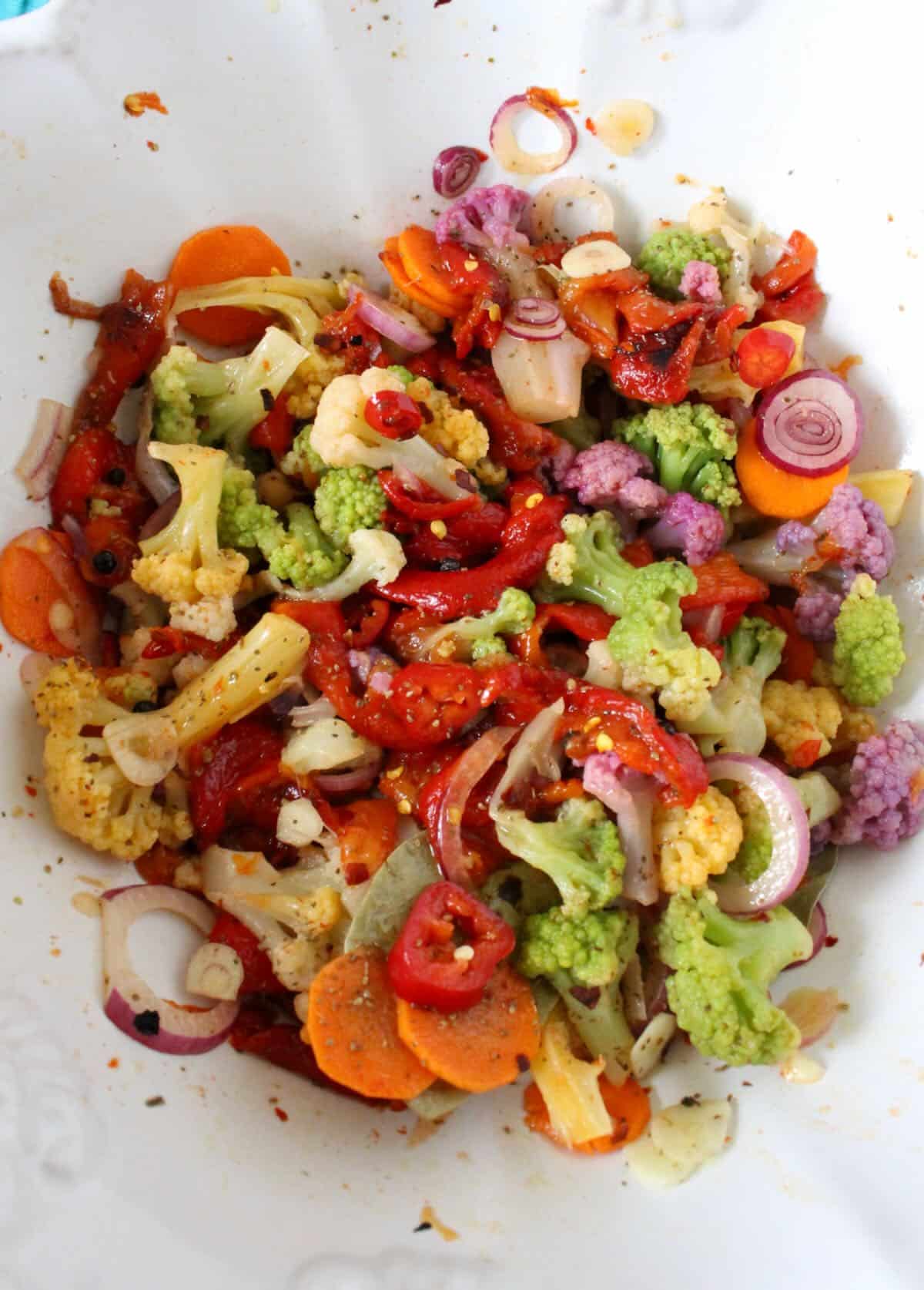 Think of what vegetables you really enjoy pickled and use them in your mix. Mine is heavy on colorful cauliflower and peppers but it’s very common to add celery, gherkins and even green beans.