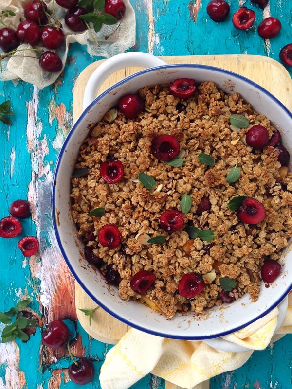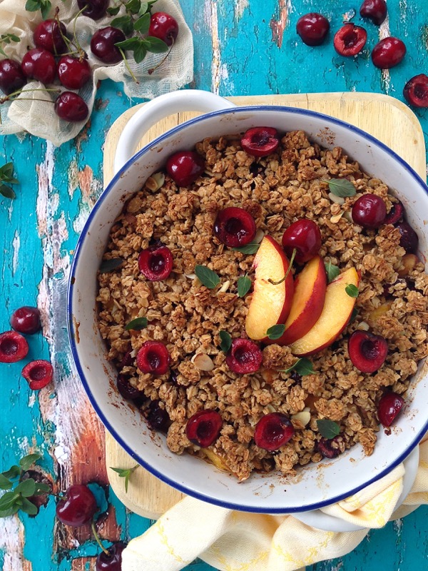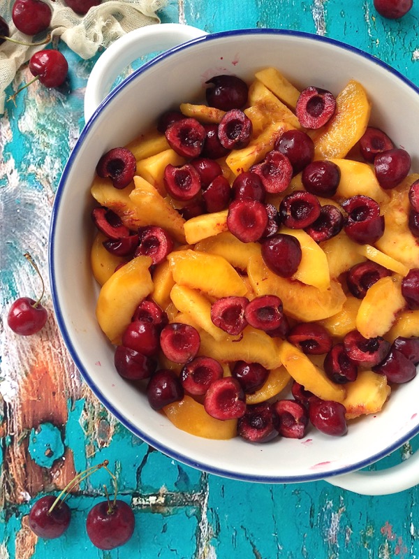 Black tart cherries and extra sweet peaches really do it for me in this crisp. However you could go for different combinations here, like peaches and blueberries or blackberries, or just keep it a pure peach fruit crisp recipe.