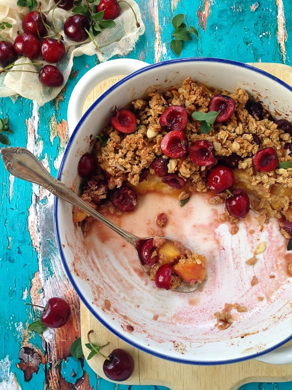 Peaches and cherries have swept me off my feet this week, hence the obvious fruit crisp recipe. Something I would normally make in the fall, because usually baked cranberry apple crisp happens on chilly fall and winter day; around our shack anyways.