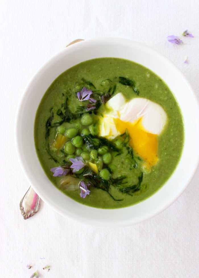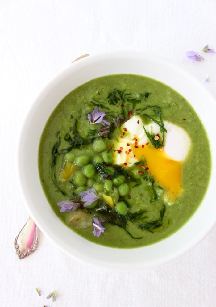 A simple and healthy homemade green pea soup made with frozen peas and lots of flavorful leeks, chive oil and served with a poached egg.