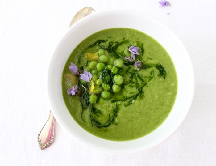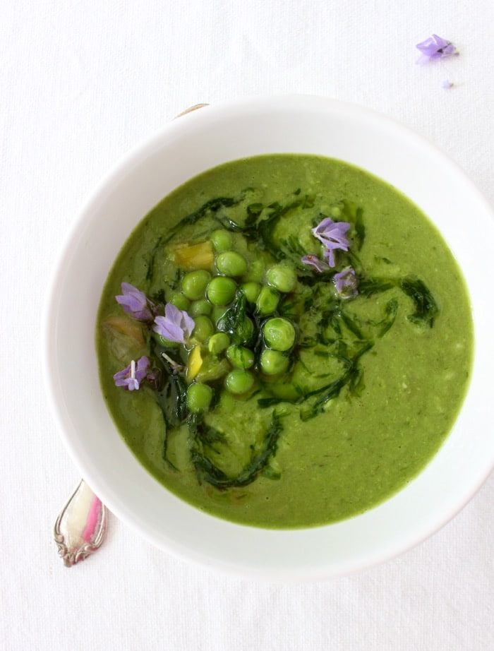 You know I like my soups and stews with hearty rustic textures, and so that’s what I went for in here as well, by pureeing only about half of the soup to give it consistency but still have cute little green peas showing up on top.
