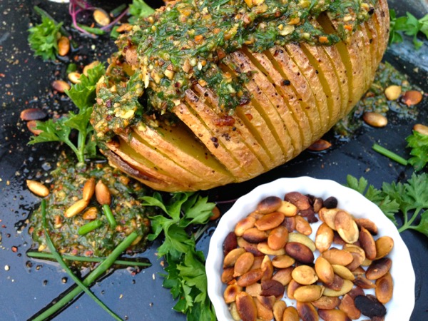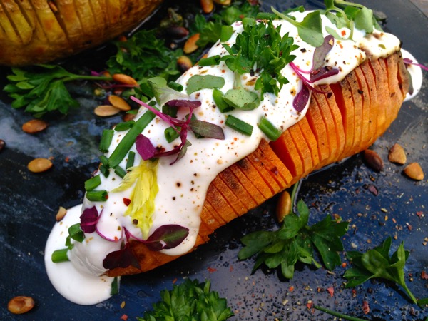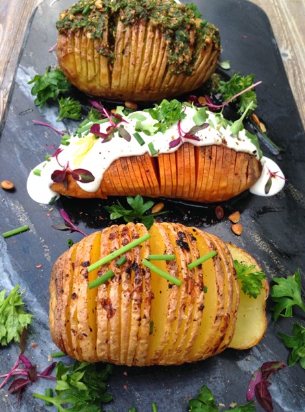 I prefer the sweet potatoes with the smooth Chimichurri sauce and the garlic creme fresh with snipped chives.