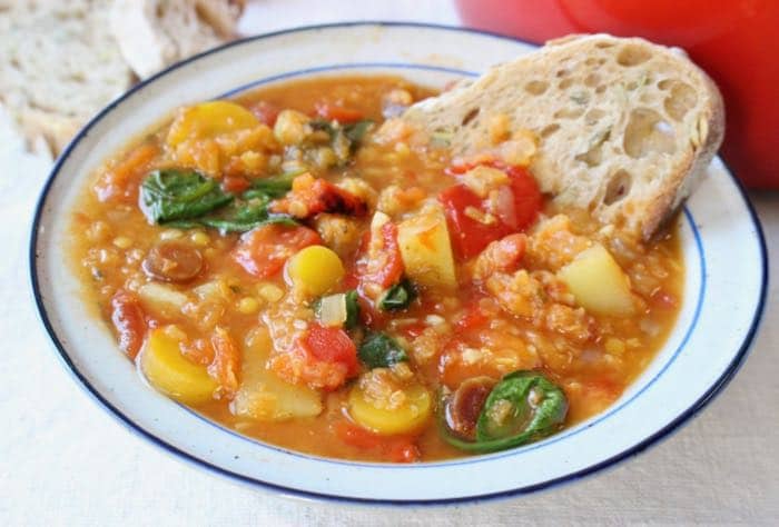 - Meanwhile add the chopped roasted peppers and the red wine vinegar. (or you can puree until smooth in a food processor then add it to the soup).Stir to combine, cover with a lid and allow the soup to simmer gently for about 20 minutes, until the lentils and potatoes are cooked through and the broth has reduced to a thick soup consistency. (If using green lentils they will need about 45 minutes to soften).Add the frozen green peas, simmer a few more minutes until heated through. Adjust seasoning to your taste with sea salt and serve hot garnished with fresh herbs, vegan sausage and a few toasted pumpkin seeds.