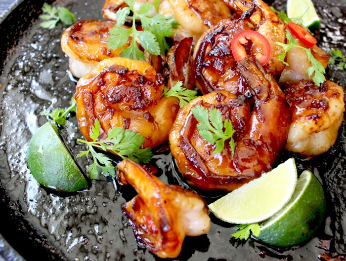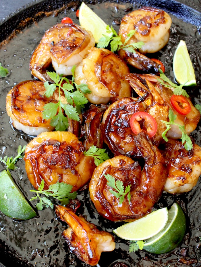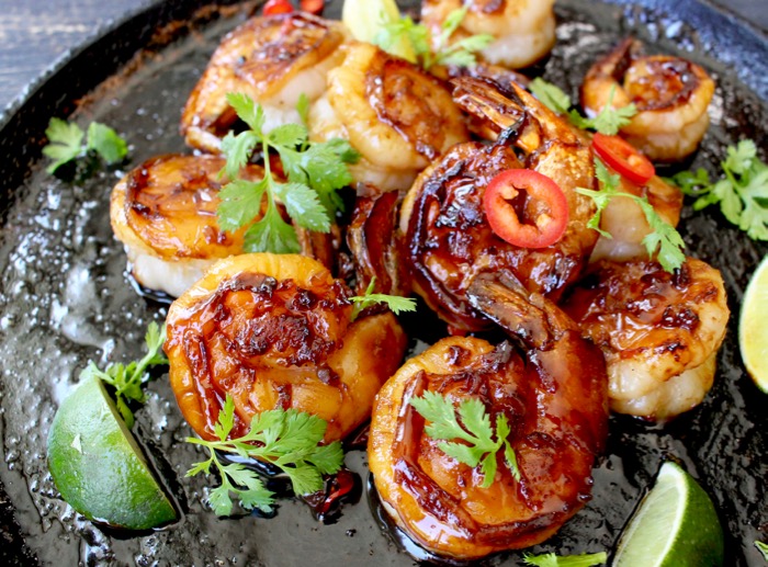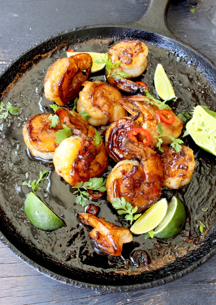 Honey garlic glazed shrimp that is ready in 10 minutes in your cast iron skillet or grill, but delivers in flavor like a Boss!