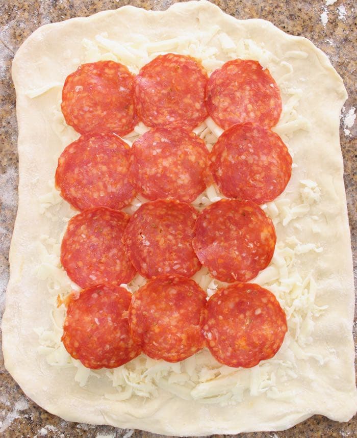 - Layer the dough with salami, ham or pepperoni slices then cover in good melting cheese, like: mozzarella, fontina, pepper jack, provolone or even swiss. You could go vegetarian of course and use a mix of sauteed peppers and onions instead. Don’t do as I did and layer the cheese first because it will ooze out and become a little messy. The BatMan likes it that way, but you do it right okay ? 😉