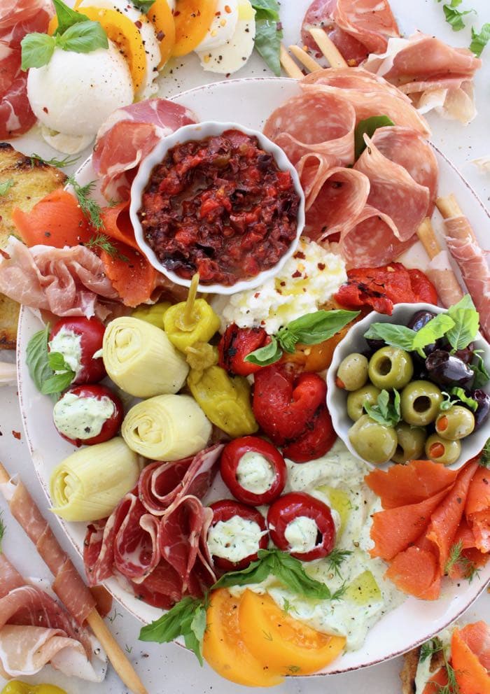 An Italian style antipasto platter loaded with thinly sliced meats, smoked salmon, marinated veggies, crostini and cheeses.
