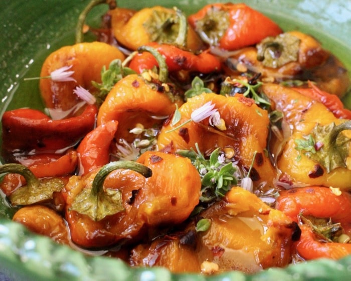 Although you could make this with bell peppers, happen to really love the little colorful sweet peppers. Once I roast them until charred on my cast iron plate, peel off the skins and marinade them as they are still with the little green stems attached to serve as handles. Not only does it save time but I also think it really adds a lot of rustic charm to my pepper salad. There are barely any seeds to speak of if any at all so no need to remove those.