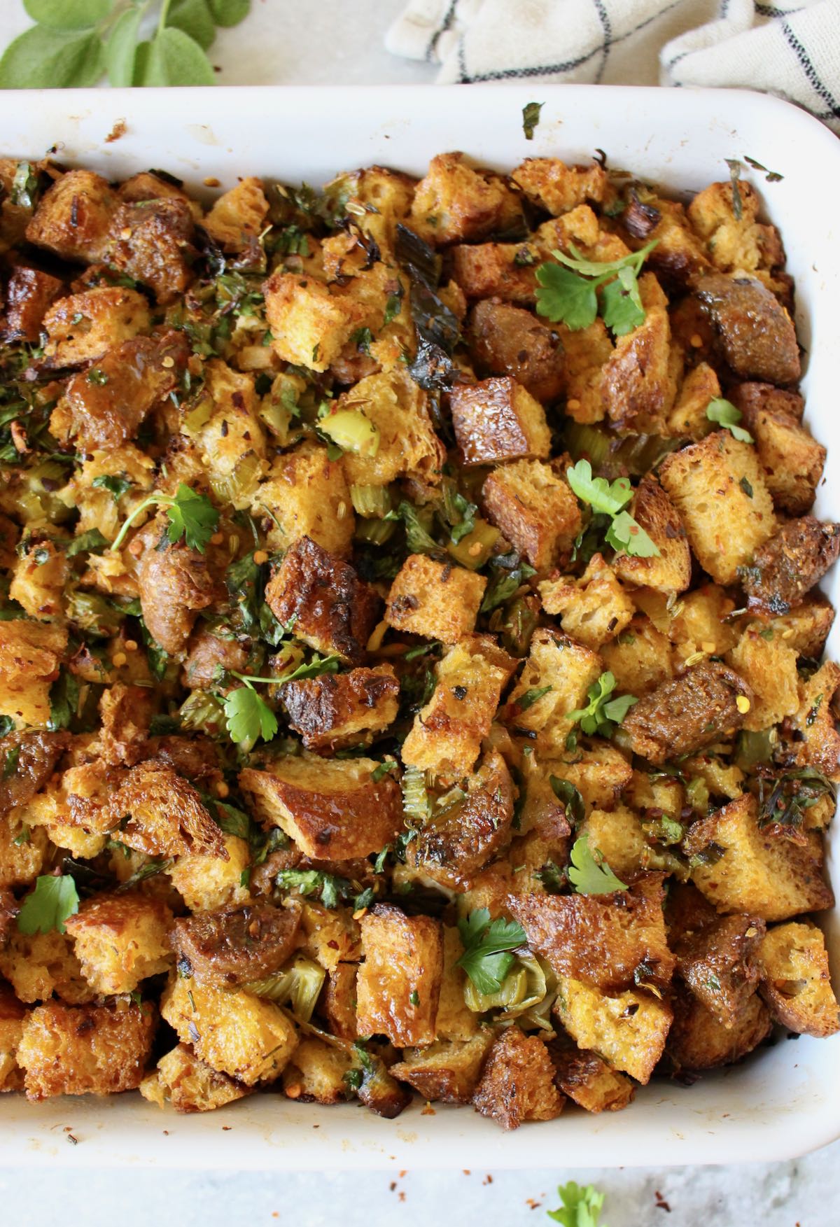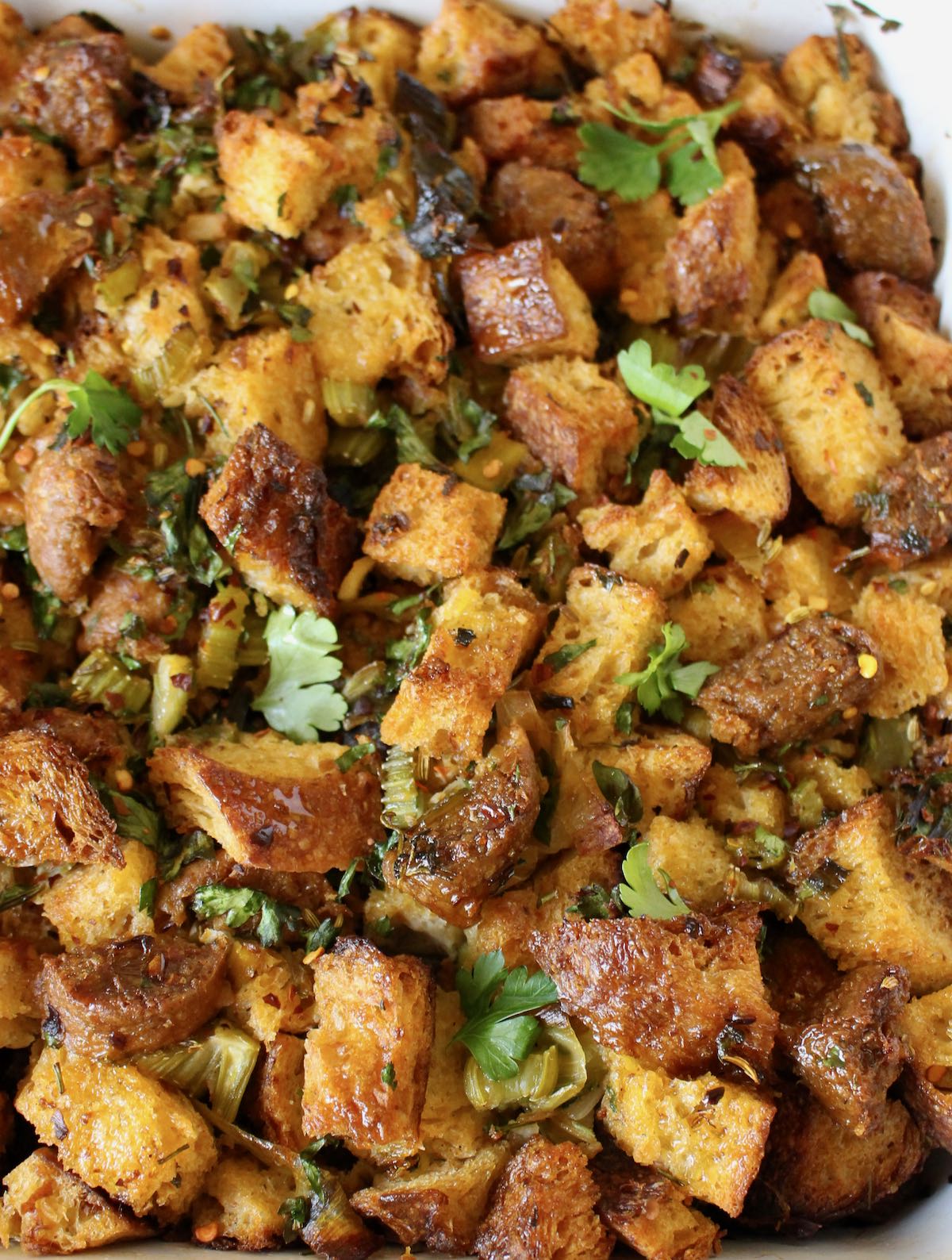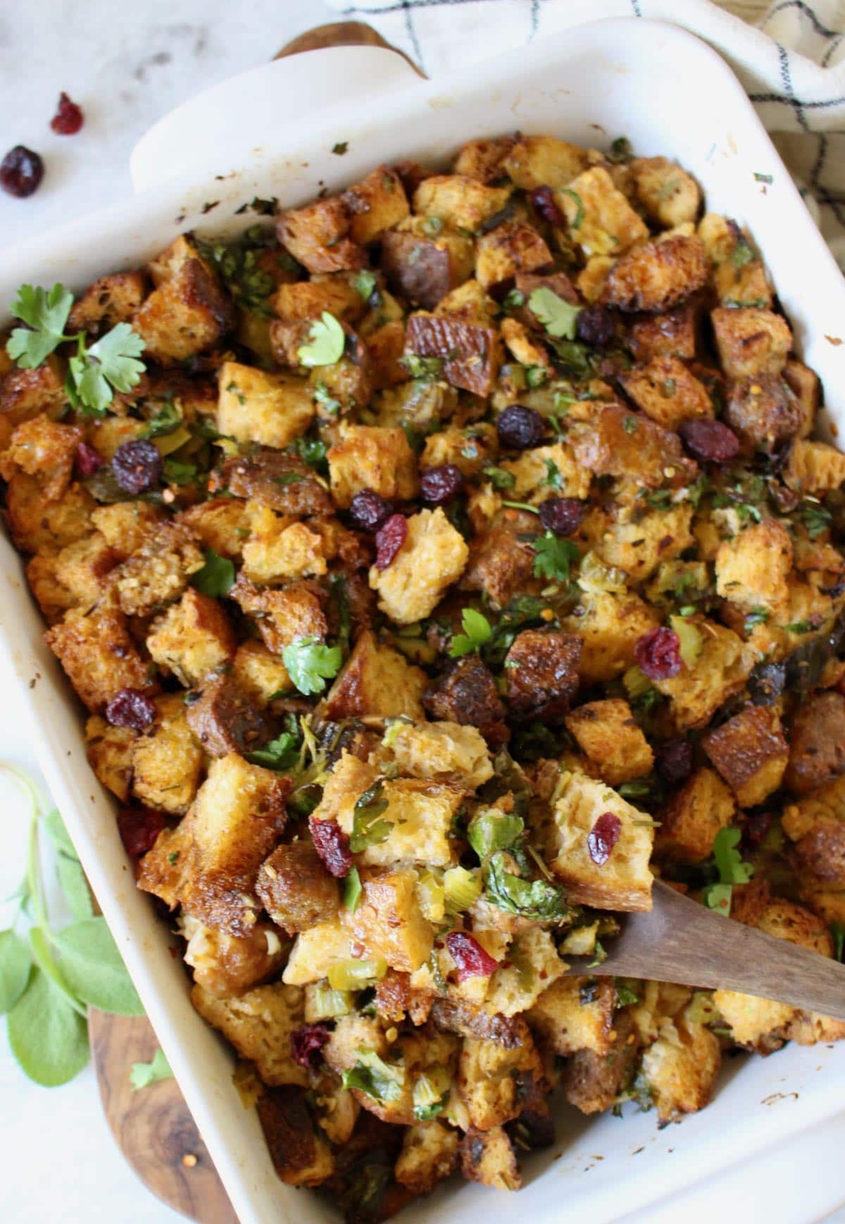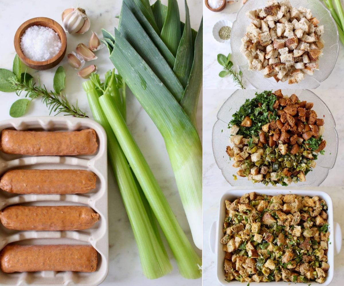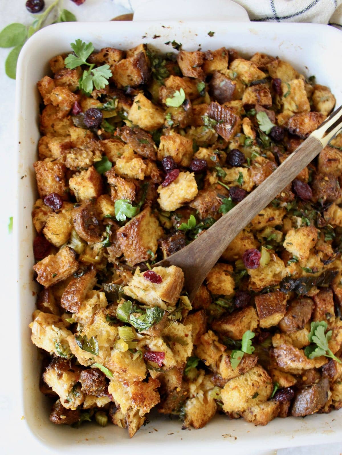 Best Italian Vegetarian Stuffing recipe for Thanksgiving and Christmas dinner. Caramelized leeks, celery, no meat sausage, fennel and the classic holiday flavors from fresh rosemary, sage and dried cranberries are tossed with dry bread cubes and veggie broth then baked until golden. Rich, savory and divine, watch the how to VIDEO below!