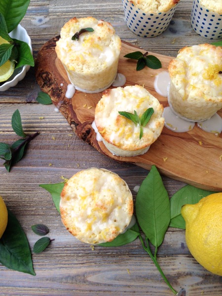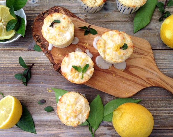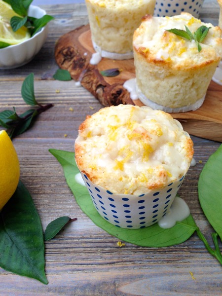 - Meanwhile prepare the Lemon Glaze by whisking the powder sugar and lemon juice together until smooth. Spoon over the cooled muffins and sprinkle with the reserved lemon zest. Garnish each muffin with a tiny mint leaf or lemon balm if available.