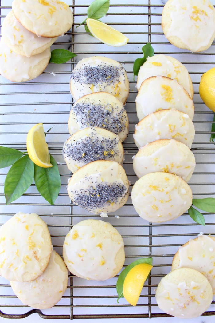 - Using a small spoon add some of the glaze to each ricotta cookie and sprinkle with the reserved lemon zest and poppy seeds.